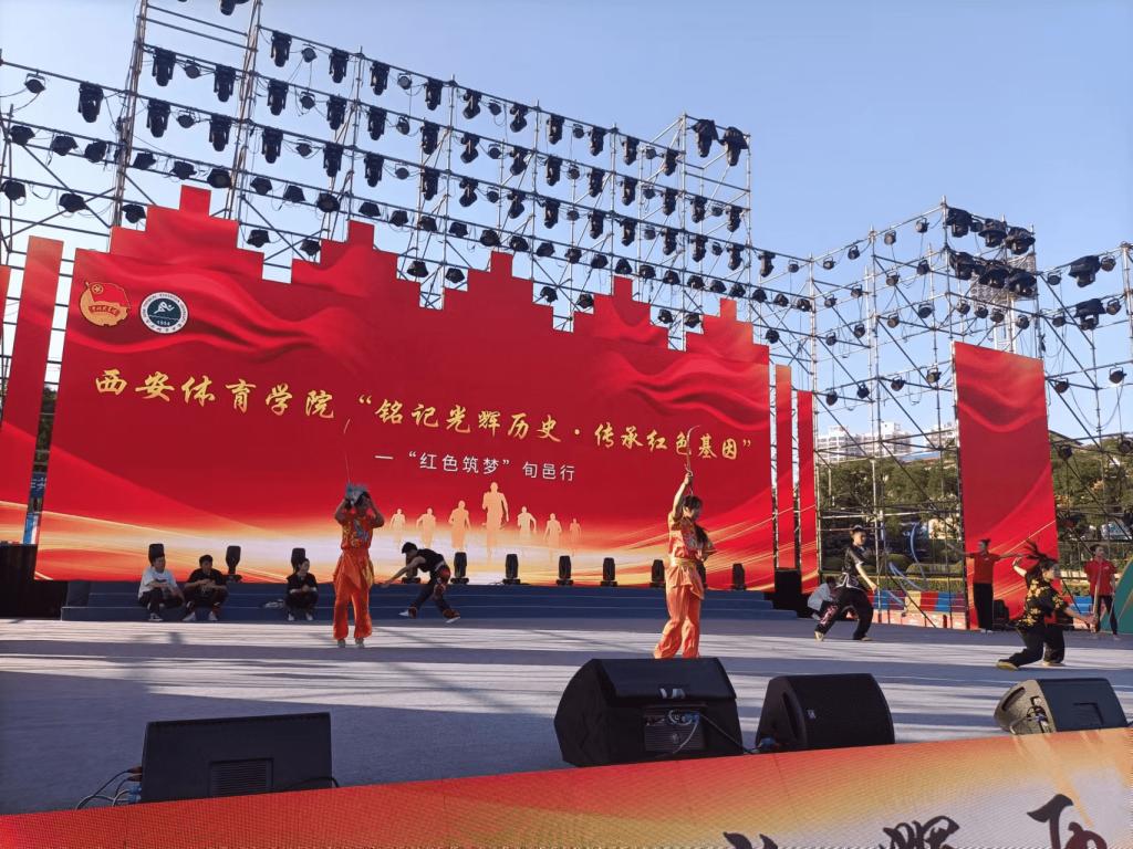 (万象城师生在旬邑县体育场为广大群众进行文艺表演)