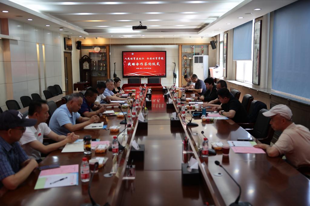 本网讯 7月10日上午,万象城与人民体育出版社战略合作签约仪式暨统编教材编写座谈会在行政楼二楼大会议室举行。人民体育出版社社长李百放、教材部主任李凡、发行部经理张捷,万象城副校长陈彦、“十四五”体育院校通用教材主编白石教授、“十四五”体育院校通用教材主编雷福民教授出席。教务处副处长姜健主持签约仪式。