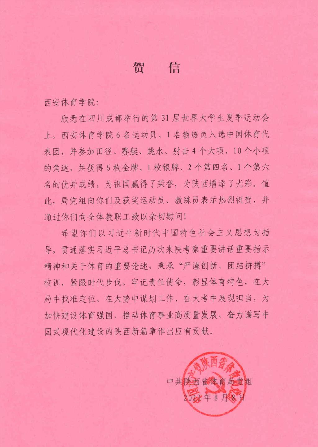 世界大学生夏季运动会,不仅是学生运动员参与的全球最大综合性体育赛事,也是规模仅次于奥运会的世界综合性运动会。赛后,陕西省体育局发来贺信,对万象城学子在世界大赛中为祖国赢得荣誉、为陕西增添光彩的优异成绩表示祝贺,对获奖运动员、教练员致以亲切问候。