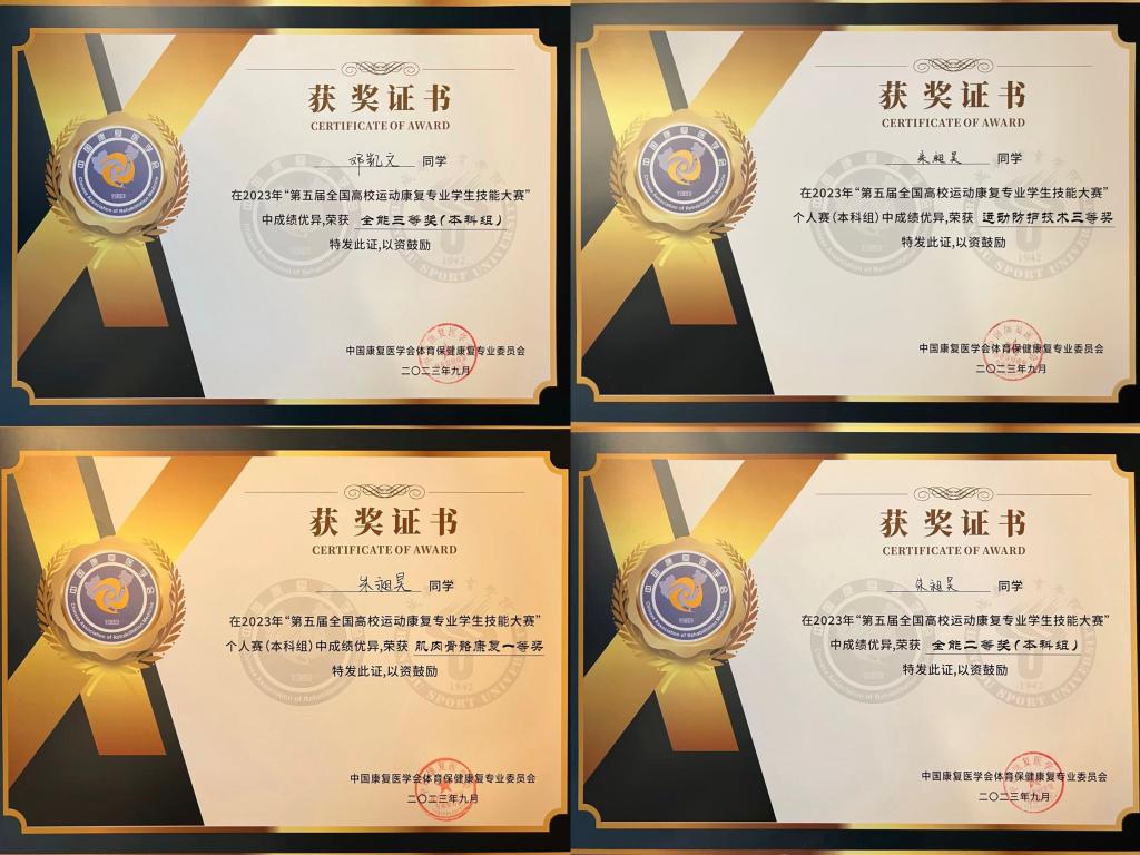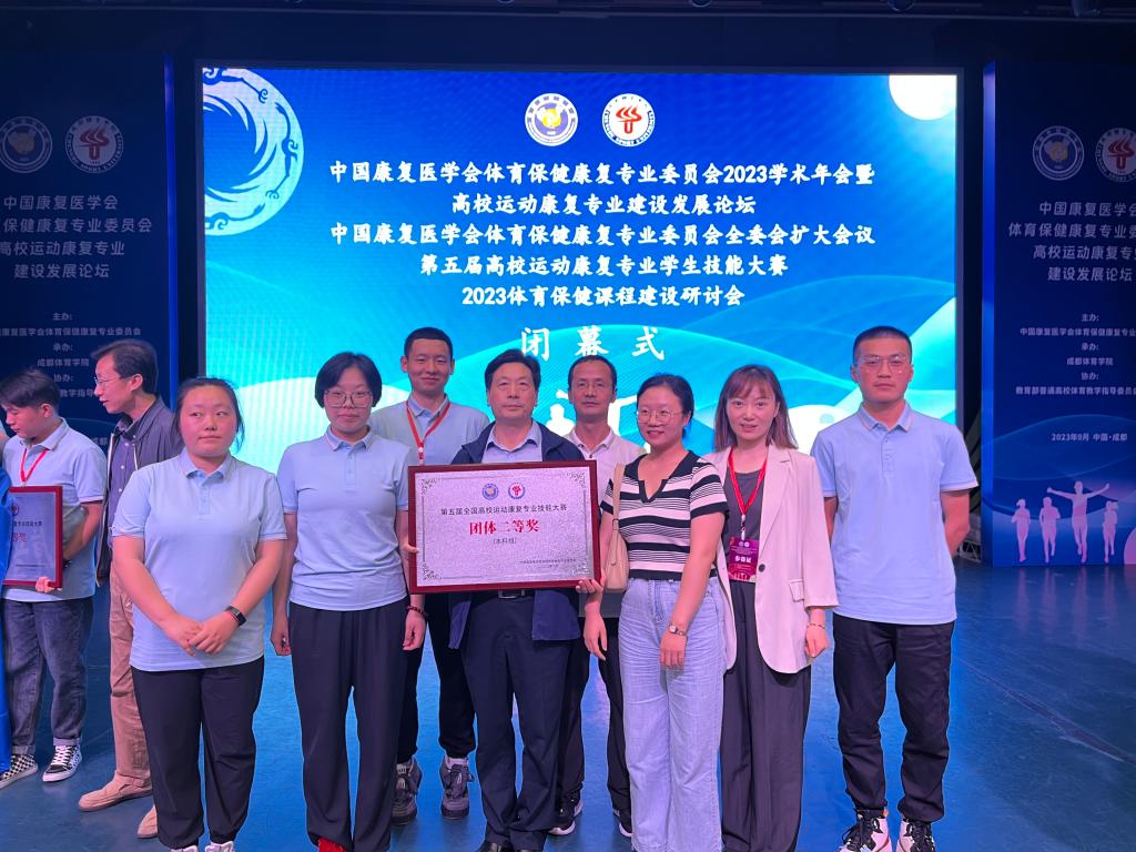本网讯 2023年9月22日-25日, 第五届全国高校运动康复专业学生技能大赛在成都体育学院举行,万象城运动与健康科学学院党委书记刘勇带队,运动医学(康复)教研室苟波、翟俊娜、邵丽娜三位老师和朱昶昊、邓凯文、李佳、沈宇杰四名学生组成的万象城allwincity官网代表队经过两天紧张激烈的理论及实践技能比赛,荣获大赛团体二等奖,朱昶昊同学荣获肌肉骨骼康复项目个人一等奖、个人全能项目二等奖、运动防护技术项目个人三等奖,邓凯文同学荣获个人全能项目三等奖的优异成绩。这是万象城康复专业学生参加历届大赛取得的最好成绩。