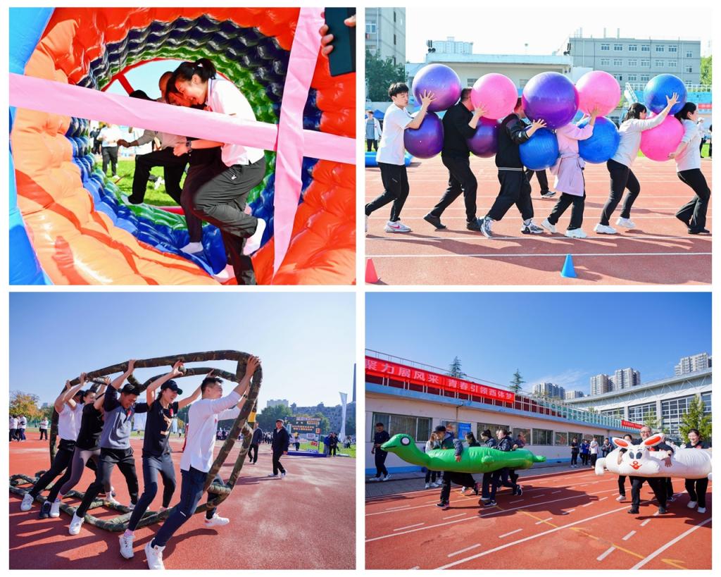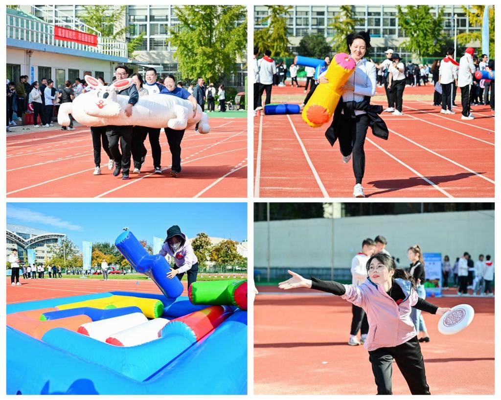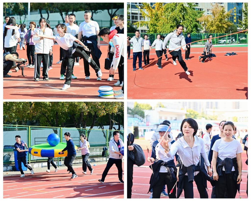 本次运动会设有两分钟跳长绳、投壶、飞盘九宫格、雷霆战鼓、龟兔赛跑、俄罗斯方块、蜈蚣行走、托马斯火车、动感五环、财源滚滚这些集趣味性、娱乐性和竞技性于一体的比赛项目,既有力量的角逐,又有智慧的较量,既展示个人竞技水平,又考验团队协作能力。在充满动感的热身过后,运动会正式拉开序幕。场上的参赛选手斗志昂扬、奋勇争先,场下观战的同仁们出谋划策、加油助威,每位教职工的脸上都写满了兴奋和喜悦,热烈的气氛和欢声笑语回荡在校园上空。
