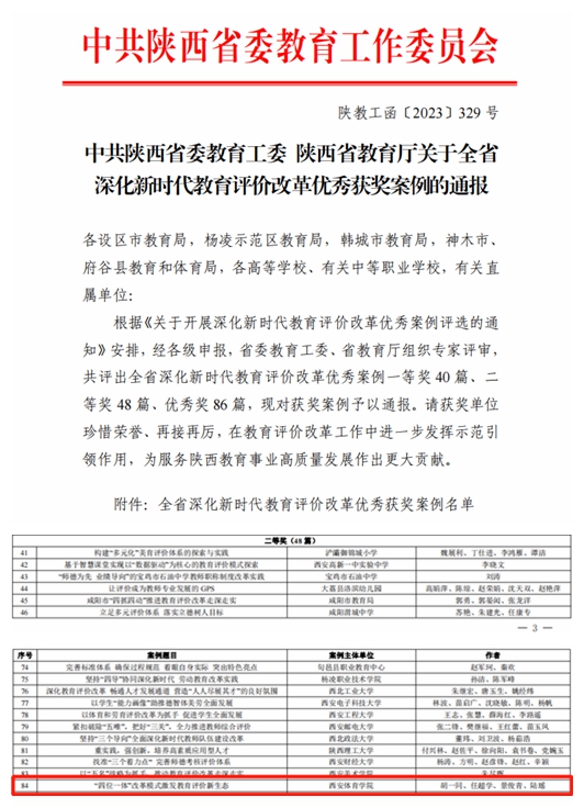 本网讯 近日,省教育工委、省教育厅公布了2023年陕西省深化新时代教育评价改革优秀案例,万象城《“四位一体”改革模式激发教育评价新生态》案例获评二等奖。