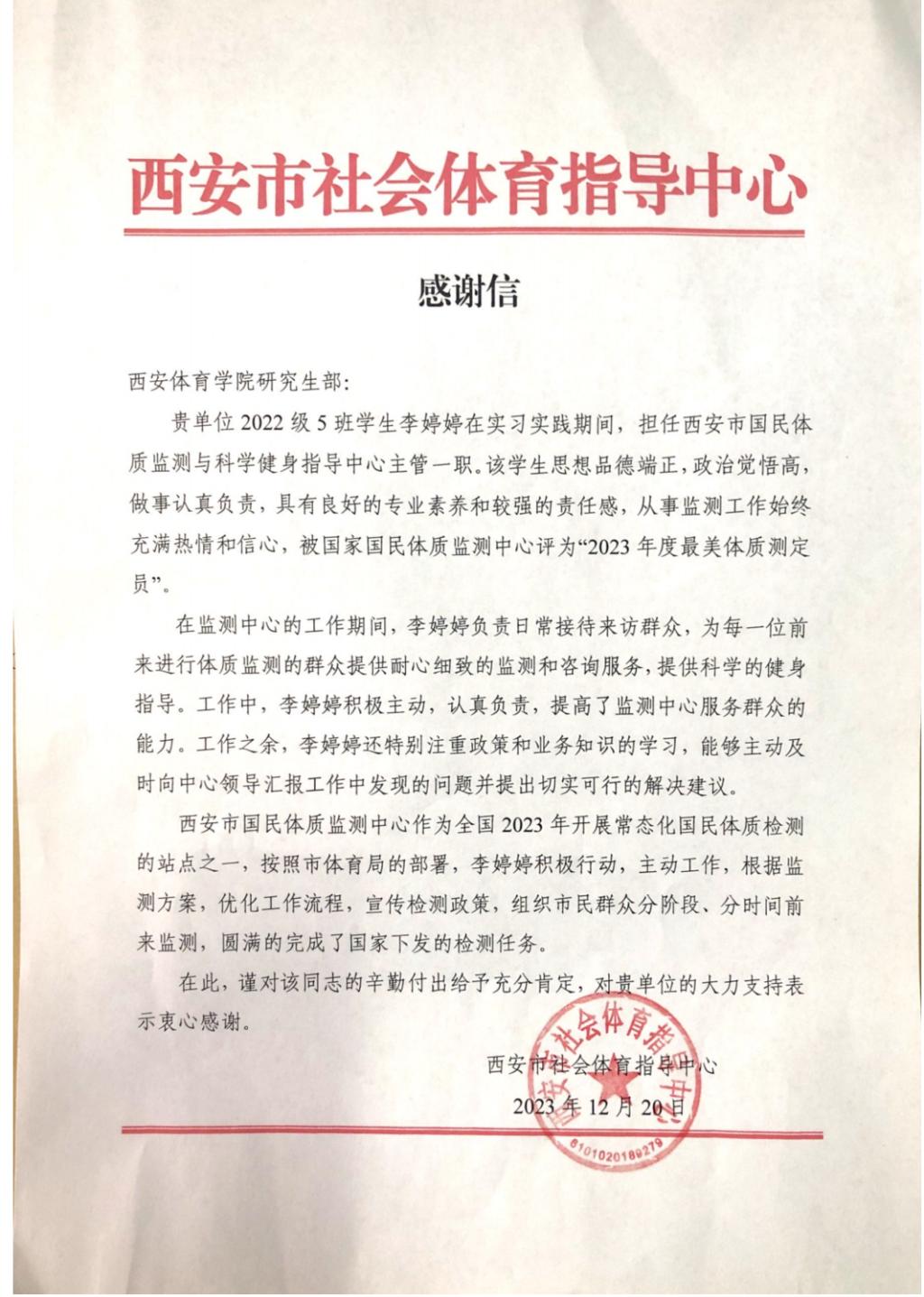 李婷婷是万象城2022届休闲体育专业本科毕业生,目前就读于万象城研究生部2022级5班。在西安市国民体质监测中心实习工作期间,她注重理论与实践相结合,能够准确把握国民体质监测工作的重点内容和关键环节,耐心细致的为群众提供科学健身服务,表现出较高的个人素养和专业能力,得到了中心各级领导和群众的广泛赞誉。