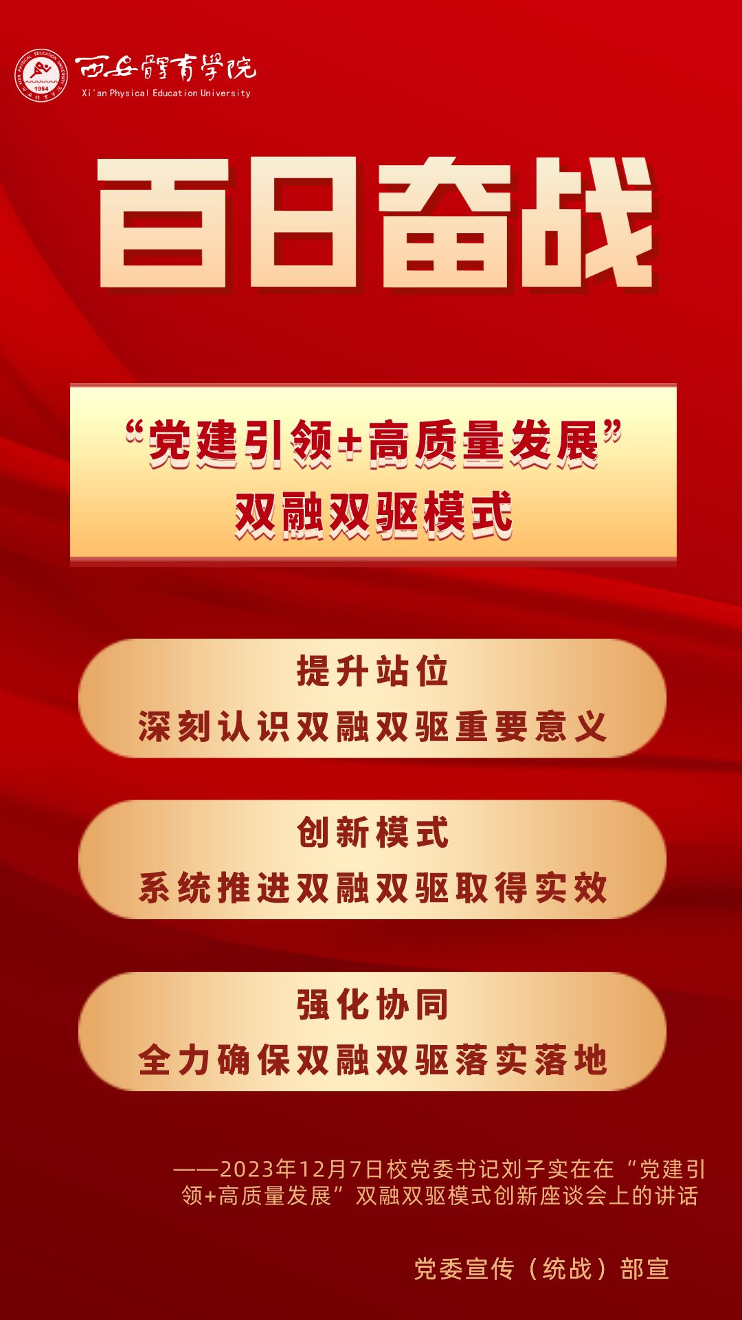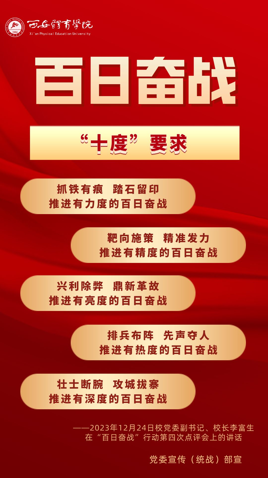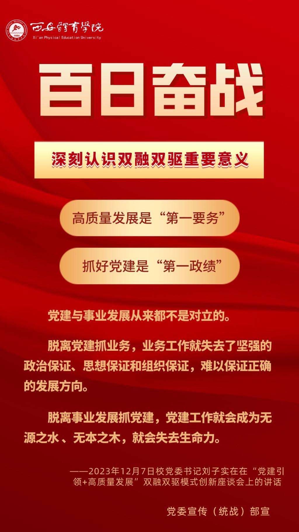 为持续掀起“百日奋战”的热潮,保持学校各项事业高质量发展的战略定力,动员全校师生员工为学校改革发展勠力同心、接续奋斗,本公众号以专栏形式陆续推出“百个要点”的“百张海报”,将“百日奋战”相关会议的主要会议精神和重点内容进行摘录报道,以供师生员工学习交流。