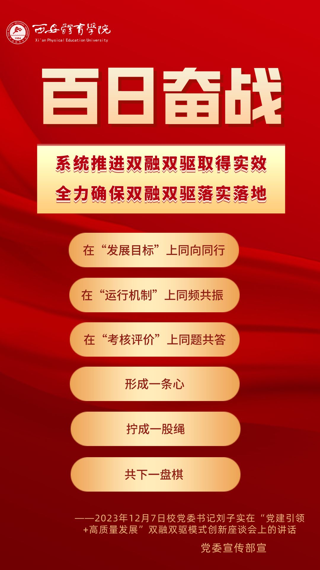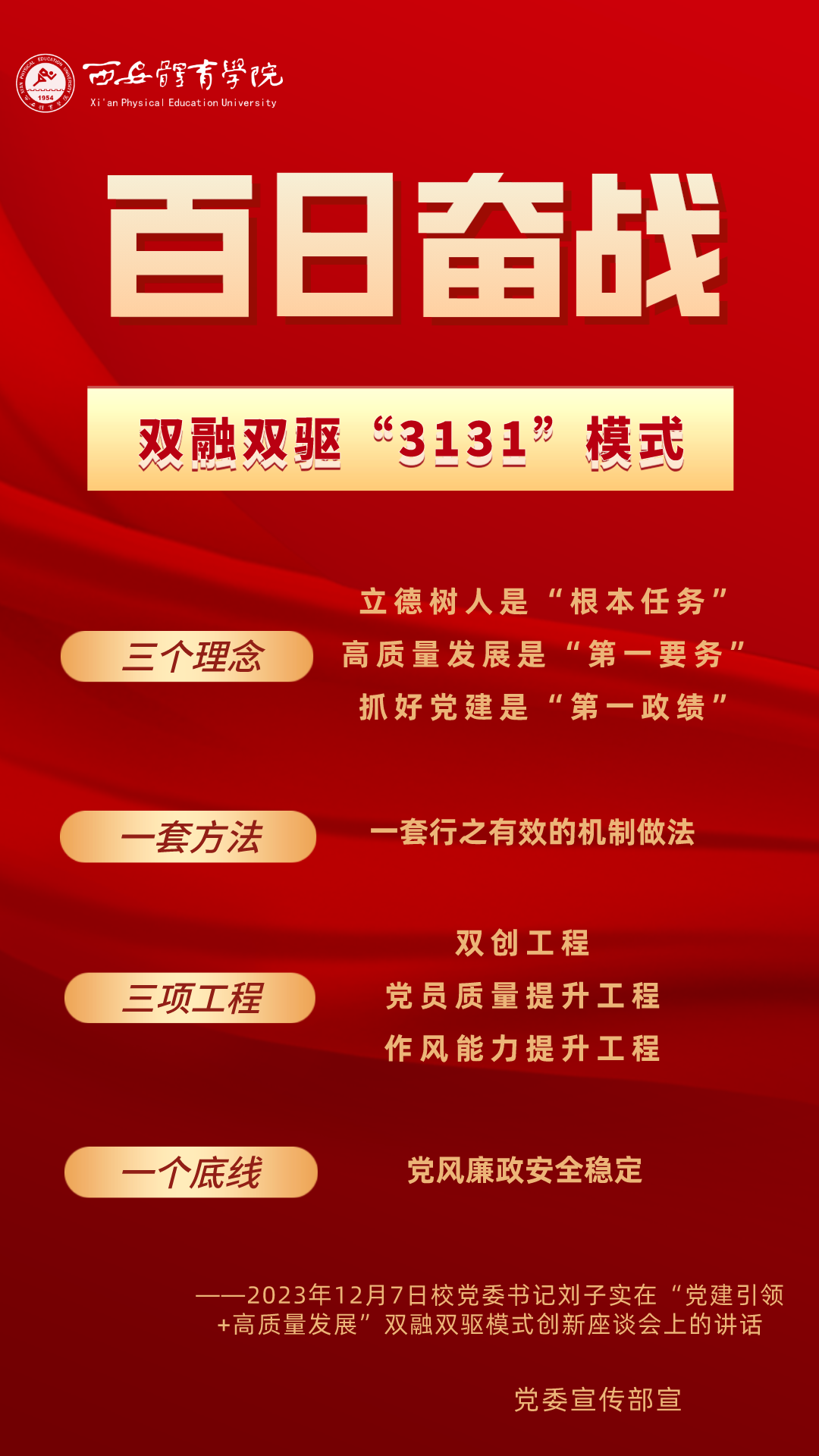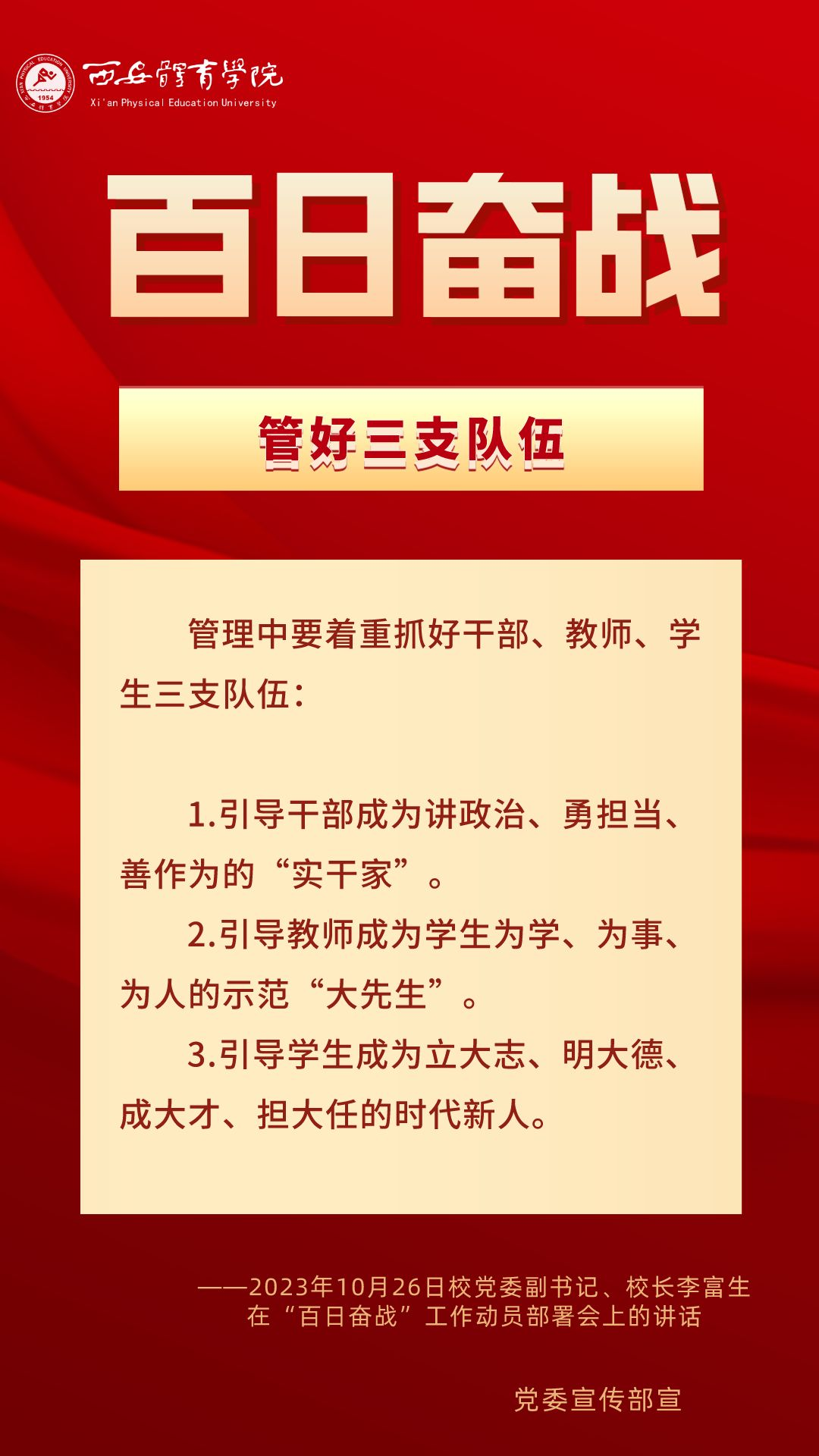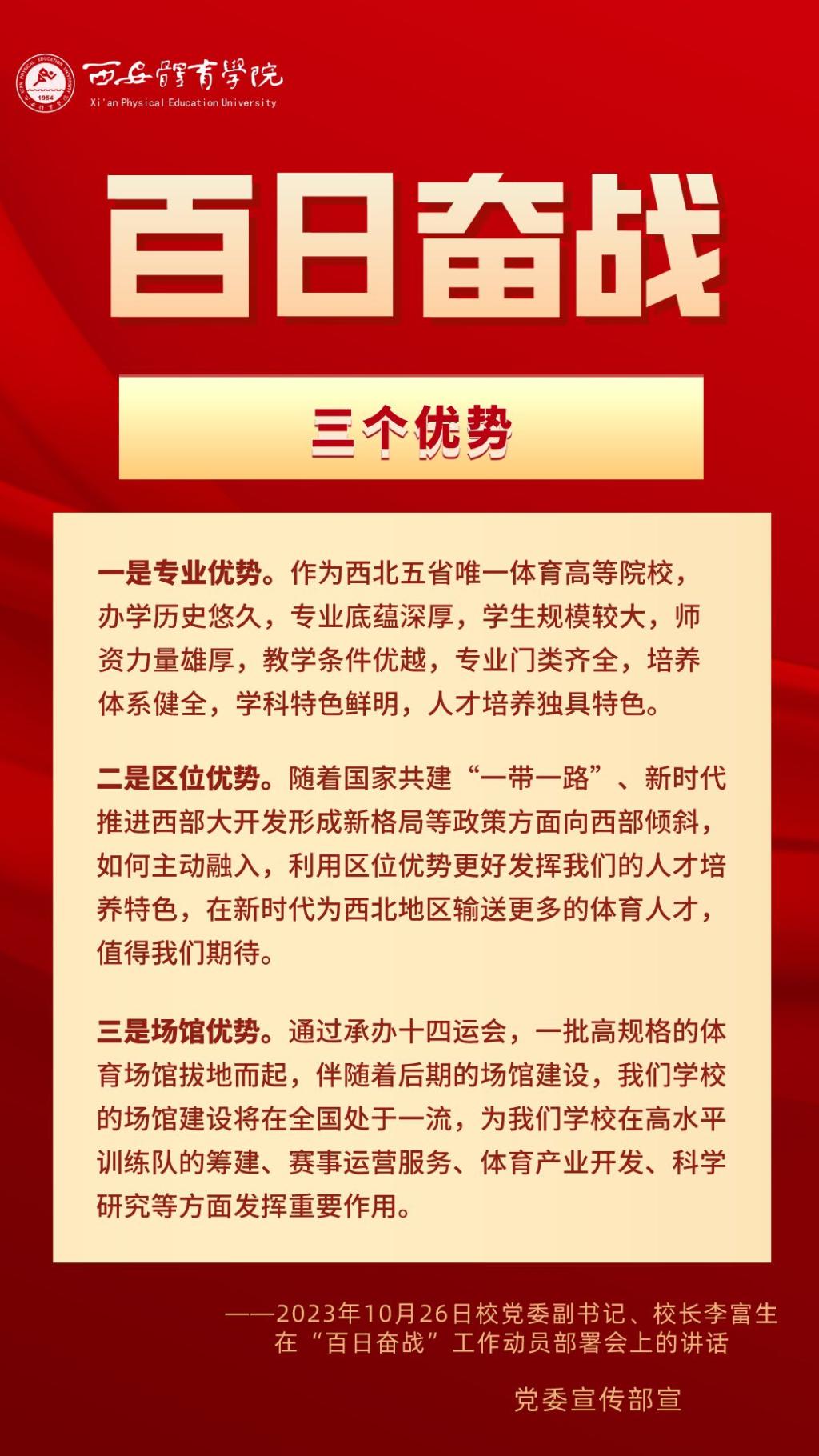 为持续掀起“百日奋战”的热潮,保持学校各项事业高质量发展的战略定力,动员全校师生员工为学校改革发展勠力同心、接续奋斗,本公众号以专栏形式陆续推出“百个要点”的“百张海报”,将“百日奋战”相关会议的主要会议精神和重点内容进行摘录报道,以供师生员工学习交流。