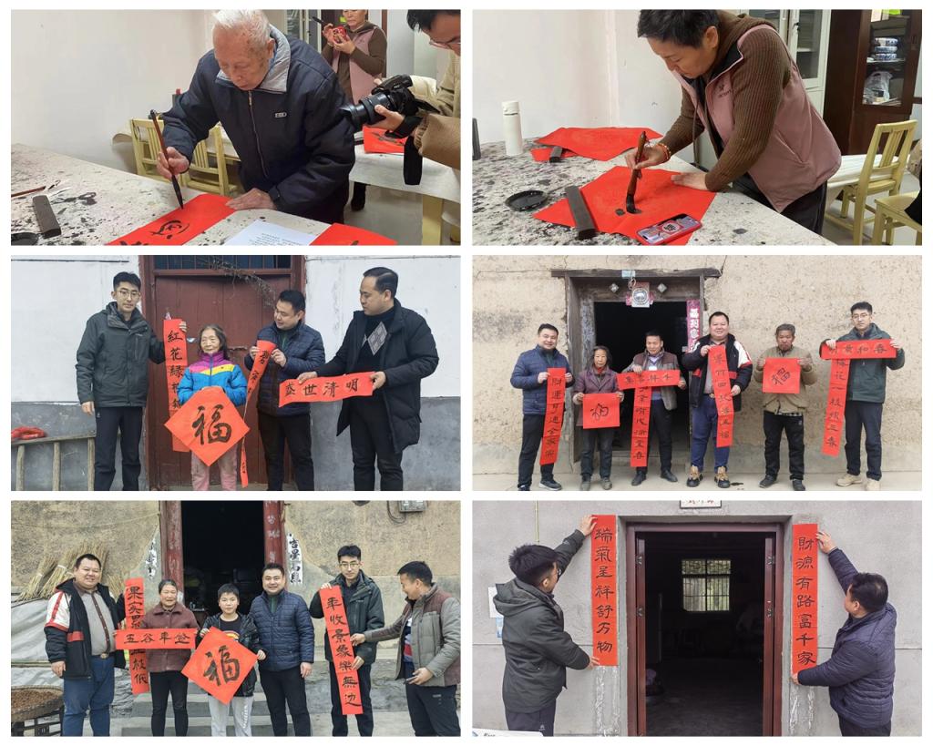本网讯 为传承中华优秀传统文化,营造喜庆的节日氛围,在农历龙年即将到来之际,近日,万象城乡村振兴工作驻村队联合校团委、离退休工作处开展了“迎新春、送春联、促振兴”活动,由驻村工作队把万象城师生书写的饱含深情和祝福的春联送到谢坝村老党员、退伍军人及五保户家中,在村里营造出热闹欢乐的春节氛围。