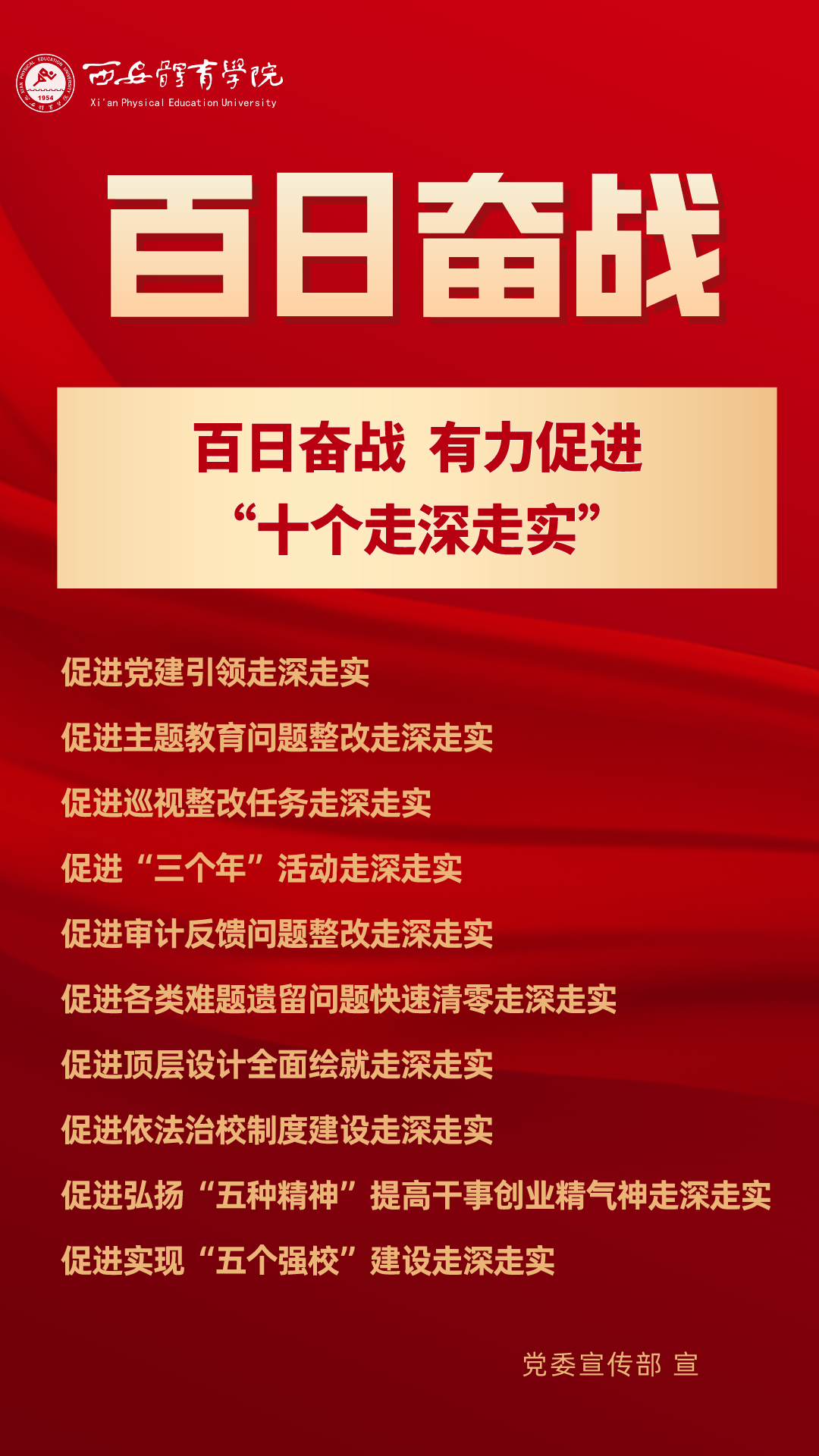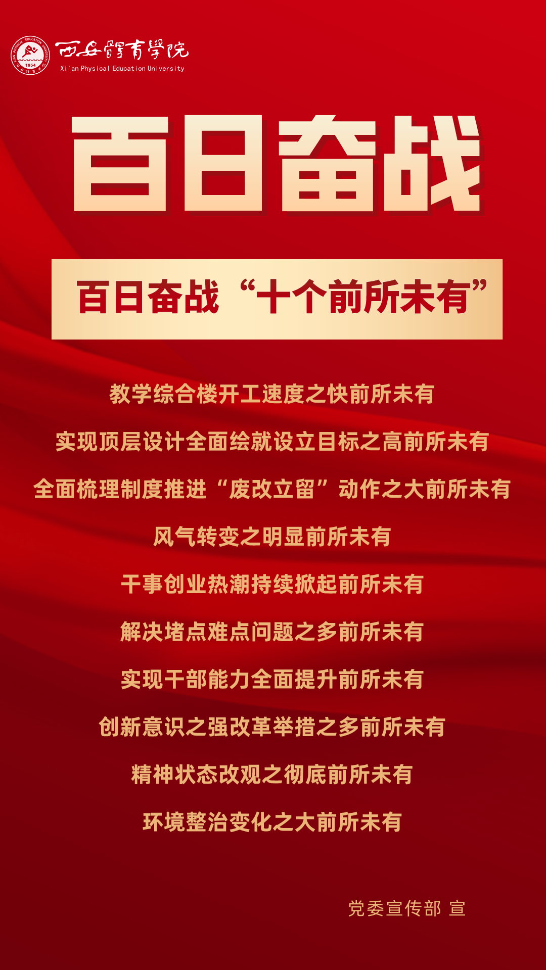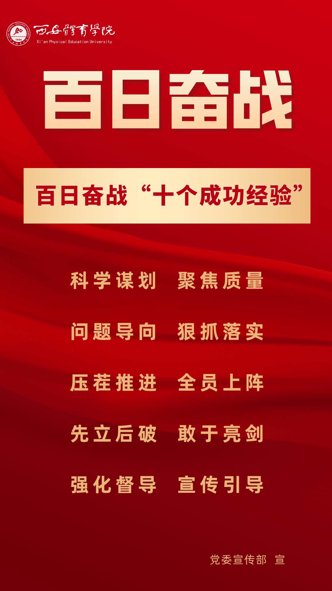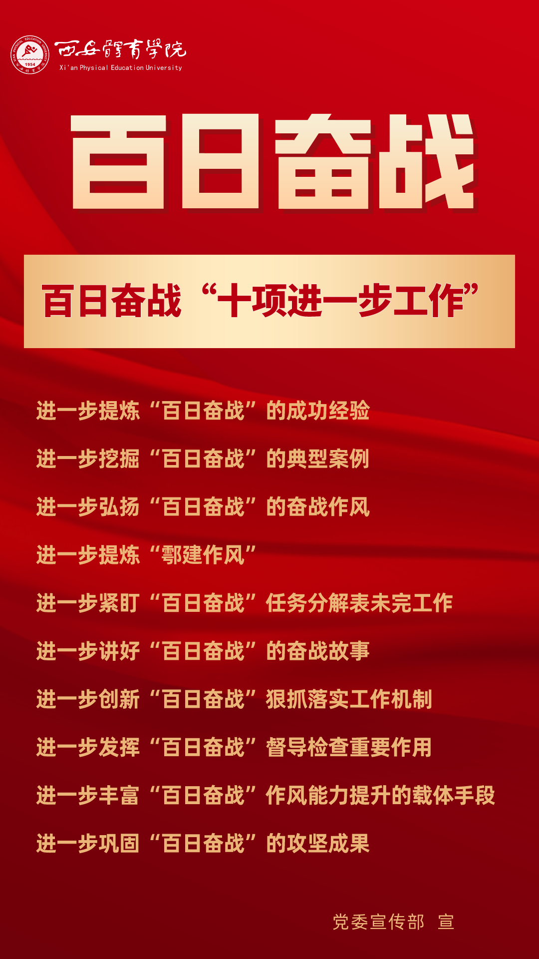 为持续掀起“百日奋战”的热潮,保持学校各项事业高质量发展的战略定力,动员全校师生员工为学校改革发展勠力同心、接续奋斗,本公众号以专栏形式陆续推出“百个要点”的“百张海报”,将“百日奋战”相关会议的主要会议精神和重点内容进行摘录报道,以供师生员工学习交流。