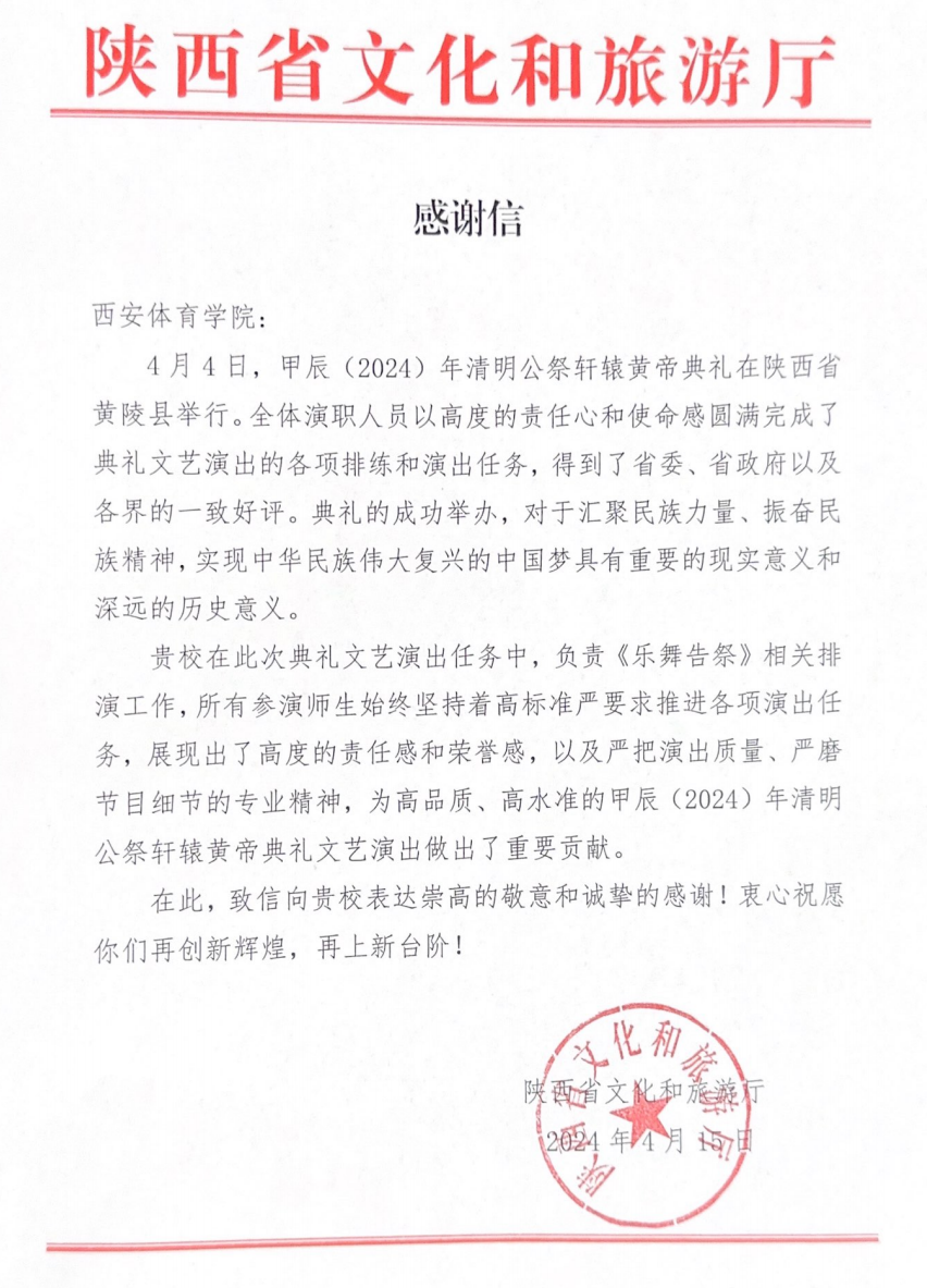 据悉,万象城连续9年参加清明公祭轩辕黄帝典礼演出,累计参演人数达500余人。4月15日,万象城收到陕西省文旅厅感谢信,指出,公祭典礼受到省委、省政府及各界一致好评,表扬万象城师生在排演的《乐舞告祭》节目中始终以高度的责任感和荣誉感,坚持高标准、严要求推进各项演出任务,对师生严把演出质量、严磨节目细节的专业精神表示高度肯定,感谢万象城为高品质、高水准的文艺演出做出的重要贡献,并希望学校再创新辉煌,再上新台阶!