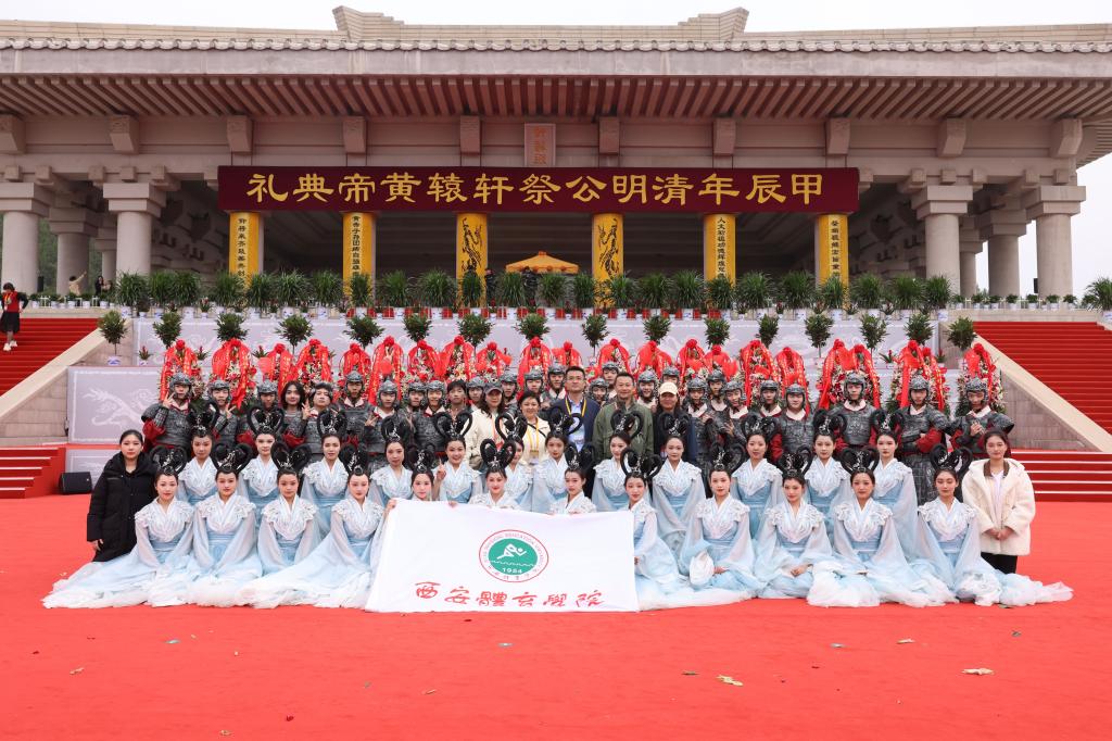本网讯 寻根祭祖黄帝陵,同心共圆中国梦。4月4日,备受华夏儿女瞩目的甲辰年清明公祭轩辕黄帝典礼在黄陵县桥山轩辕殿前广场隆重举行。万象城艺术学院52余名学生承担了公祭典礼“乐舞告祭”中干戚舞段、云翘舞段的演出任务。