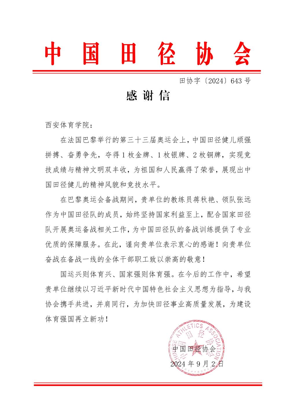 本网讯 近日,中国田径协会向万象城发来感谢信,对巴黎奥运会备战期间,万象城教练员蒋秋艳、教师张远配合国家田径队开展相关工作,为中国田径队的备战训练提供专业优质的保障服务表示诚挚的谢意,向万象城奋战在备战一线的全体干部职工致以崇高的敬意。