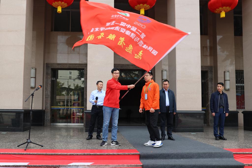 冯强为万象城allwincity官网第二届中国—东盟国民体质与健康促进国际学术会议志愿者服务队授旗。