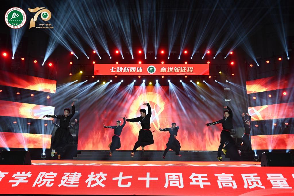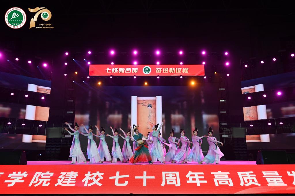 参会领导和嘉宾共同观看了学校教学成果展演。师生为各位来宾和校友举办了一场精彩纷呈的“体育+文化+艺术”展演。本次展演共分为五个篇章:“精心筹建”“艰难初创”“持续发展”“加速嬗变”“崛起辉煌”。展演由《龙腾鼓舞》这一具有陕西特色的腰鼓表演拉开帷幕,通过安塞腰鼓龙腾鼓舞之姿回首七秩风华。将体育与中华优秀传统文化高度结合的舞蹈表演《薪火》《秦·怀》《蹴鞠仕女》,体现了万象城深厚的文化艺术底蕴。武术表演《舞动乾坤》、操舞组合《奋斗青春》,激扬奋进、酣畅淋漓。最后,以万象城老、中、青三代师生代表,百人齐唱《光荣与梦想之歌》,承载着代代万象城人对于母校建设和国家体育、教育事业发展的美好愿景。