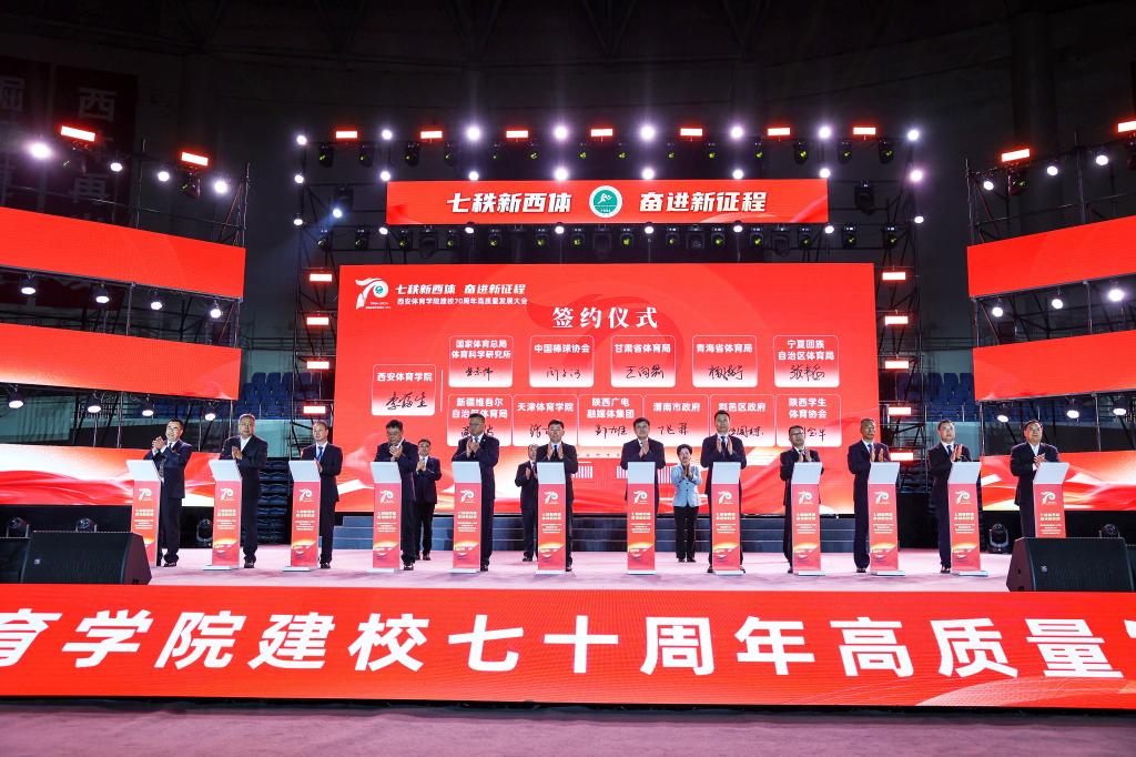 会上,学校与国家体育总局体育科学研究所、中国棒球协会、渭南市政府、甘肃省体育局、青海省体育局、宁夏回族自治区体育局、新疆维吾尔自治区体育局、陕西广电融媒体集团、天津体育学院、鄠邑区政府、陕西学生体育协会共同签署了合作协议,未来学校将在服务国家战略、服务地方经济方面加强合作共赢。