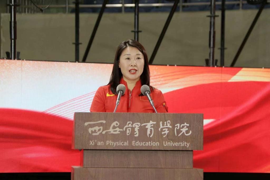 教师代表蒋秋艳以《秉承体育精神共筑万象城辉煌》为题进行了发言,用“梦想与坚持”“责任与担当”“务实和拼搏”三个关键词向2024级新生交流了感悟与期待,分享了参与巴黎奥运会备战工作的宝贵经历,她用中国竞走运动员杨家玉和李炎东的事例向同学们阐释了奋斗与拼搏的重要性,勉励同学们要坚定信念、追求卓越;刻苦训练、持之以恒;团结协作、共同进步,以梦想与坚持铸就辉煌。