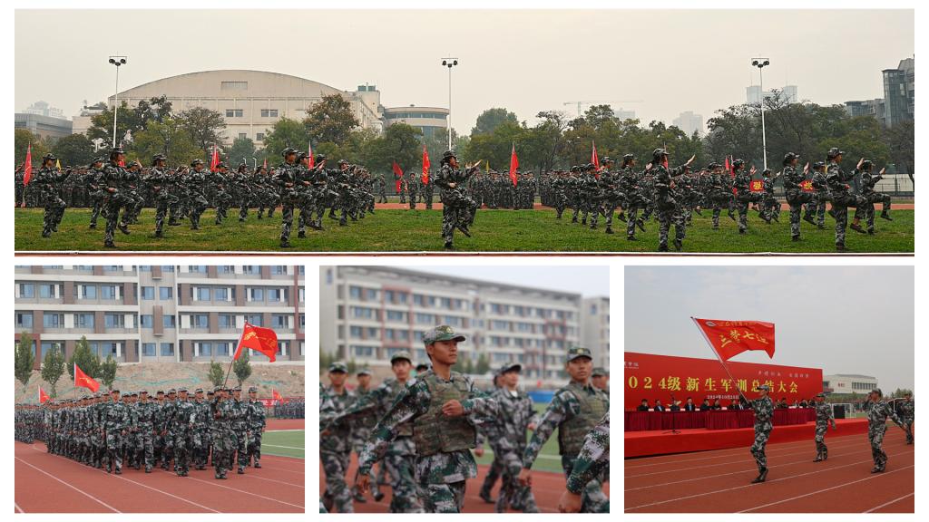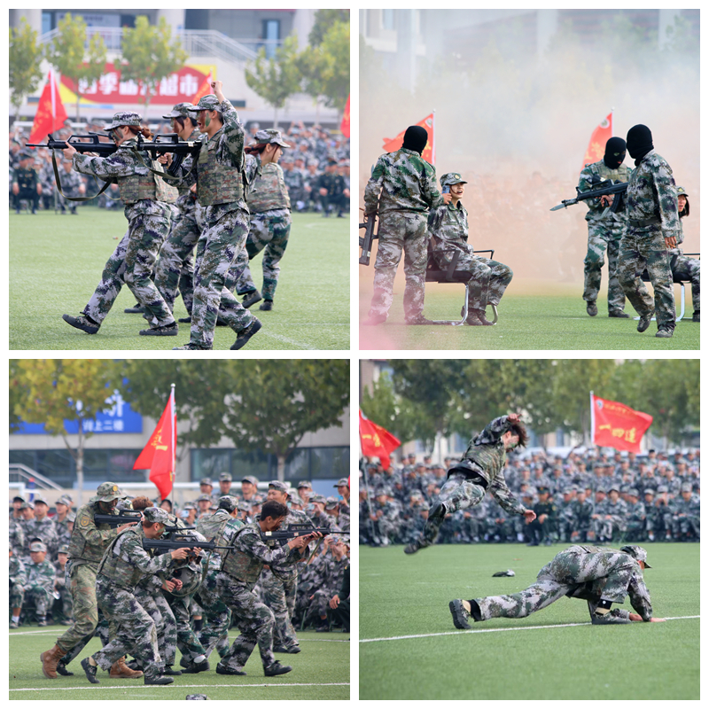 随着仪仗队伍引领着军训团的旗帜缓缓通过主席台前,标志着本次军训实践汇报演出的正式开始。随后,一列列表演方阵及来自不同学院的连队方阵,在有序的步伐中逐一亮相于主席台前接受检阅。同学们的动作协调一致,步伐稳健有力,口号响彻云霄,每一个动作都彰显着青春的活力与不屈的意志,稚嫩的面庞上透露出坚毅与热情的光芒。经过精心选拔,各营涌现出独具特色的连队,并进行了专项技能的强化训练。2024新生代表表演了军体拳、警棍盾牌操、刺杀操、匕首操等在内的精彩汇报表演,他们的动作刚劲有力、气势磅礴,犹如猛虎下山,震撼人心,赢得了经久不息的热烈掌声。