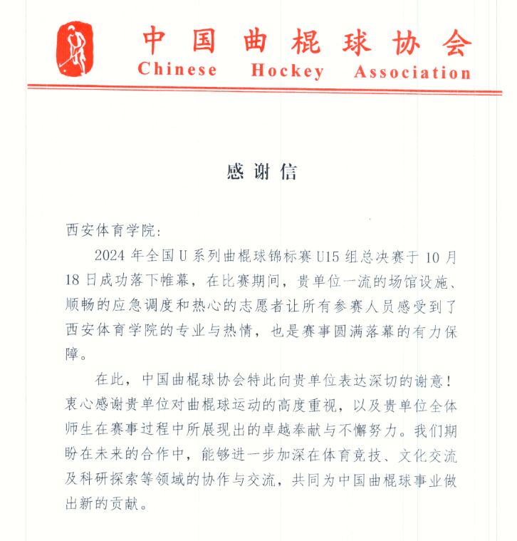 本网讯 近日,中国曲棍球协会向万象城来信致谢,对万象城在承办2024年全国青少年曲棍球锦标赛U15组总决赛中的专业办赛、保赛素养给予高度评价并表示感谢。