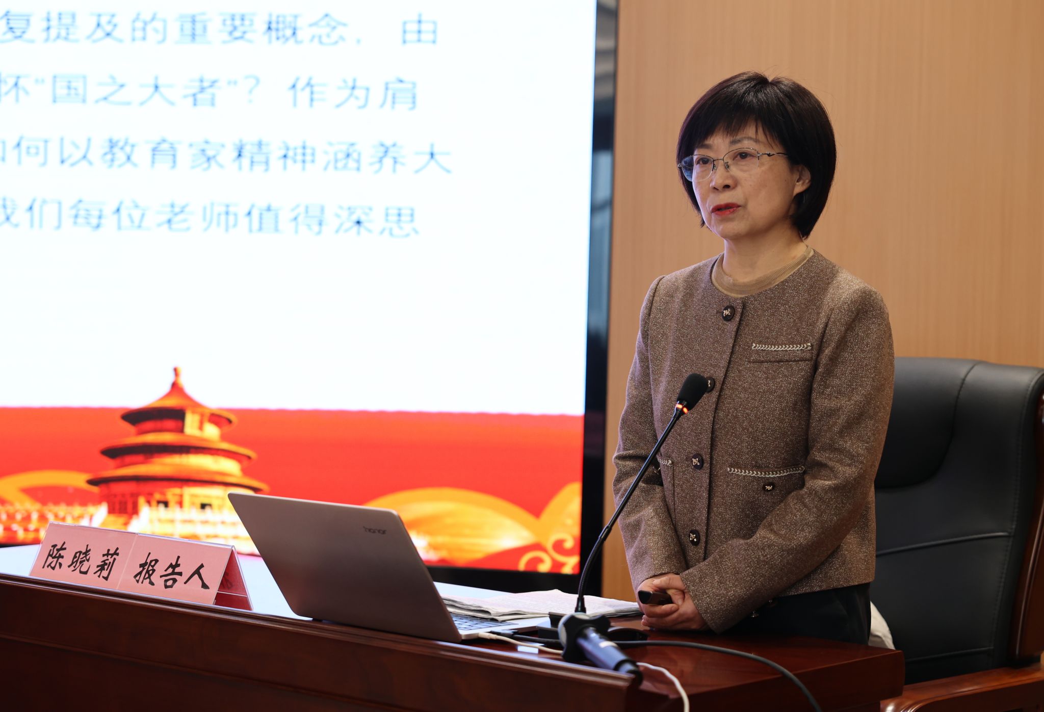 陈晓莉教授是从“国之大者”重要论述、基本内涵和创新过程;提高政治自觉,强化责任担当,对“国之大者”要心中有数;心怀“国之大者”担当时代大任,以教育家精神涵养“大国良师”三个方面深刻阐释了何为“国之大者”以及如何将“国之大者”与教育家精神相结合,做立大志、明大德、成大才、担大任、入大学、顾大局、顺大势、成大师的“大国良师”。报告深入浅出,脉络清晰,剖析透彻,环环相扣,既是“师德集中学习教育”专题学习,又是一堂高水准思政课。报告会引发了在座教师强烈共鸣,现场掌声不断。