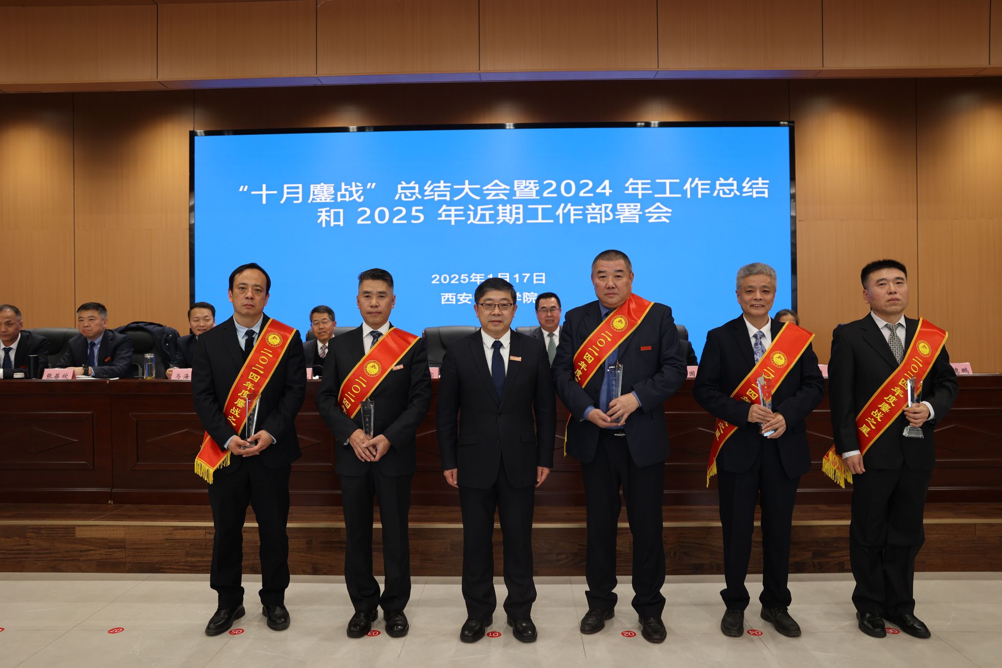 党委副书记、纪委书记、监察专员杨芳乾宣读2024年度“鏖战之星”、优秀部门等表彰名单。校领导对甘泽军等十位“鏖战之星”,基建处、党委校长办公室、竞赛训练处、教务处、鄠邑校区管理委员会五个优秀部门及获得“鏖战铁军”“鄠建铁军”称号的基建处,进行表彰并颁发奖杯。