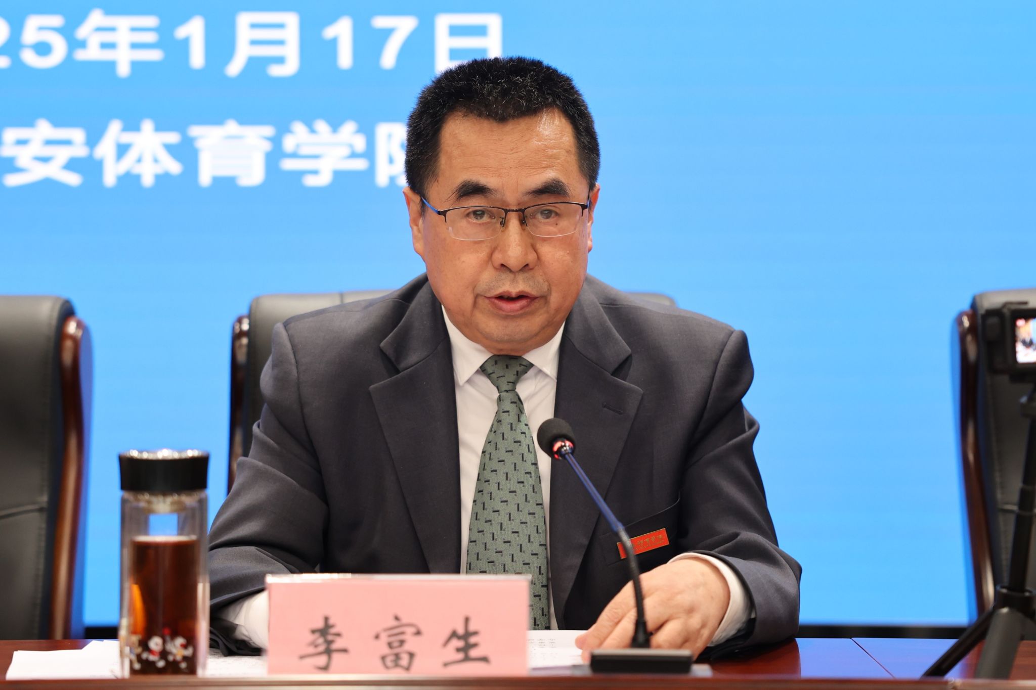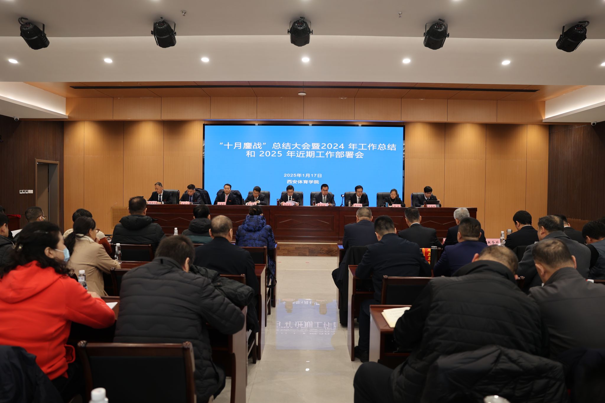 校长李富生作题为《守正创新超越 自信自立自强 十月鏖战圆满收官 全面开启高质量快速度跨越式发展新纪元新路径新探索》的讲话。李富生从十大成绩、十大亮点、十大成果、十条经验、十个不断等五个方面总结了“十月鏖战”的成效。十大成绩即规划建设工程成为标杆、创收造血工程突破明显、崛起辉煌工程卓有成效、作风建设工程初见成效、训练提升工程全力突破、人事改革工程奋力推进、教学改革工程创新提升、学科建设工程良性起步、科研改革工程引起重视、保障提升工程有所改进。十大亮点即教学办公综合楼如期竣工、建校七十周年高质量发展大会圆满成功、2025年女子垒球亚洲杯申办成功、中国东盟国际学术会议胜利召开、陕西省体教融合研究中心挂牌成立、女垒省队校办显成效、鄠邑主校区落成并投入使用、携手中国足协共建足球学院、学校行政主体搬迁鄠邑校区顺利完成、“鄠建作风”得到广泛宣传。十大成果即抢抓贯彻党的二十届三中全会机遇,创造新平台,实现新辉煌;抢抓体育强国建设机遇,创造新模式,实现新探索;抢抓教育强国建设机遇,创造新成果,实现新突破;抢抓健康中国建设机遇,创造新视野,实现新提升;抢抓科技强国建设机遇,创造新奇迹,实现新纪元;抢抓人才强国建设机遇,创造新神话,实现新转折;抢抓文化强国建设机遇,创造新校风,实现新自信;抢抓校区主体调整机遇,创造新赛道,实现新跨越;抢抓校庆成功举办机遇,创造新思路,实现新目标;抢抓奋战鏖战推进机遇,创造新速度,实现新路径。十条经验即得益于坚持党建引领,得益于省委省政府的坚强领导,得益于国家体育总局的精心指导,得益于总局各项目中心和协会的大力支持,得益于省体育局、省教育厅领导指导、得益于省级有关部门、各省属高校及各有关市区政府鼎力支持;得益于西北各有关省区体育局及全国各体育院校的大力支持、得益于学校科学做好顶层设计、得益于学校党政同向发力、得益于全体师生共同努力。十个“不断”即不断提炼“十月鏖战”的成功经验、不断挖掘“十月鏖战”的典型案例、不断弘扬“十月鏖战”的鏖战作风、不断提炼“十月鏖战”的“鄠建作风”、不断汇编“十月鏖战”典型事迹文集、不断讲好“十月鏖战”的鏖战故事、不断提升“十月鏖战”宣传力度、不断总结“十月鏖战”的工作机制、不断深化“十月鏖战”督导作用的研究、不断推进“十月鏖战”未完事项落实。
