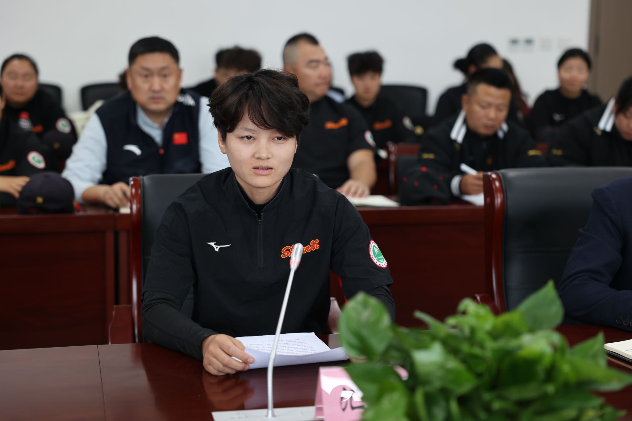 顾艺代表运动员深情发言,感谢省体育局、学校的关心支持,她表示,这支平均年龄不到22岁的队伍从成立至今已经脱胎换骨,大家将会以精准的投球、默契的配合、顽强的防守,在赛场上诠释铁血精神,以团结为盾,以拼搏为剑,为梦想而战,为陕西争光。