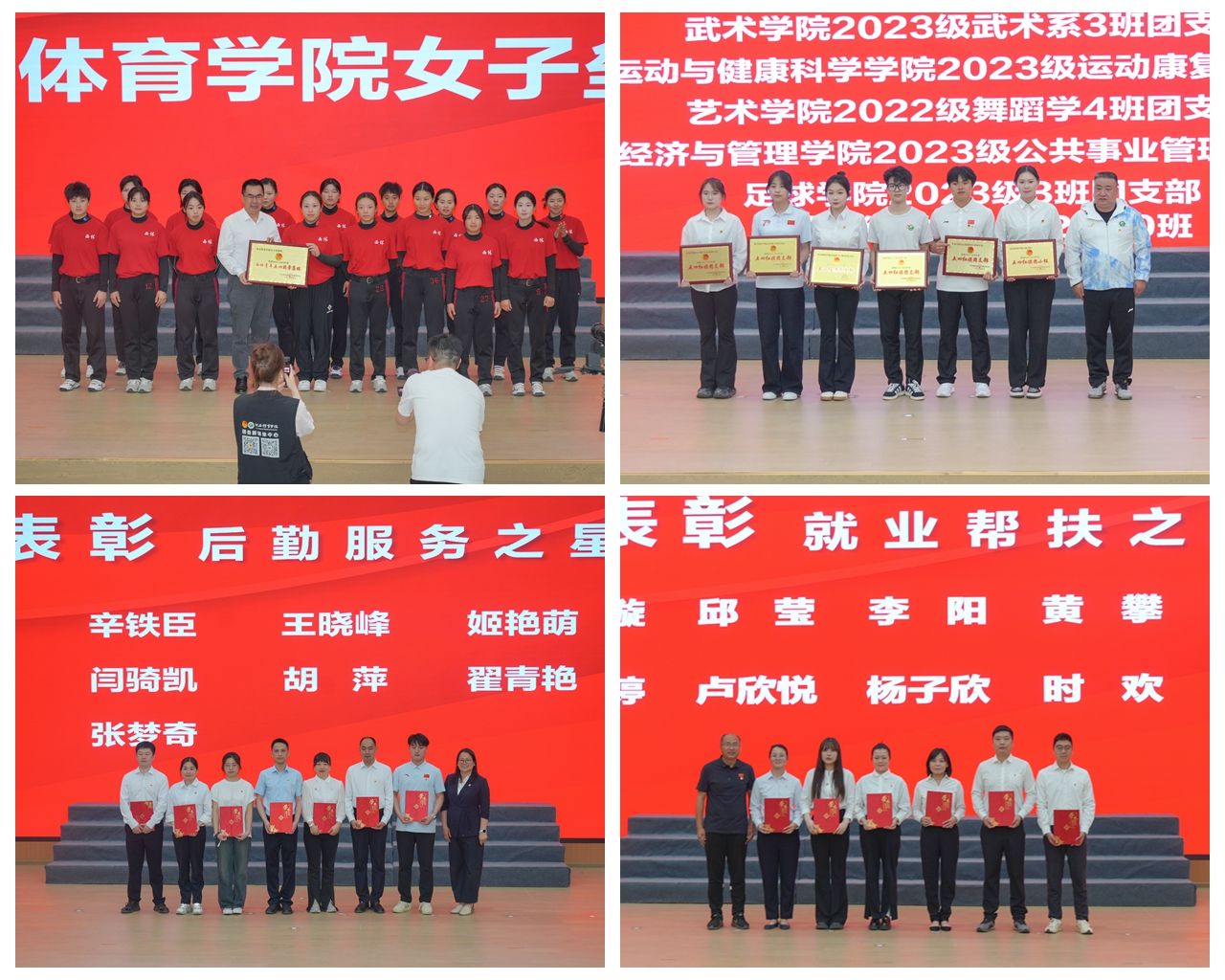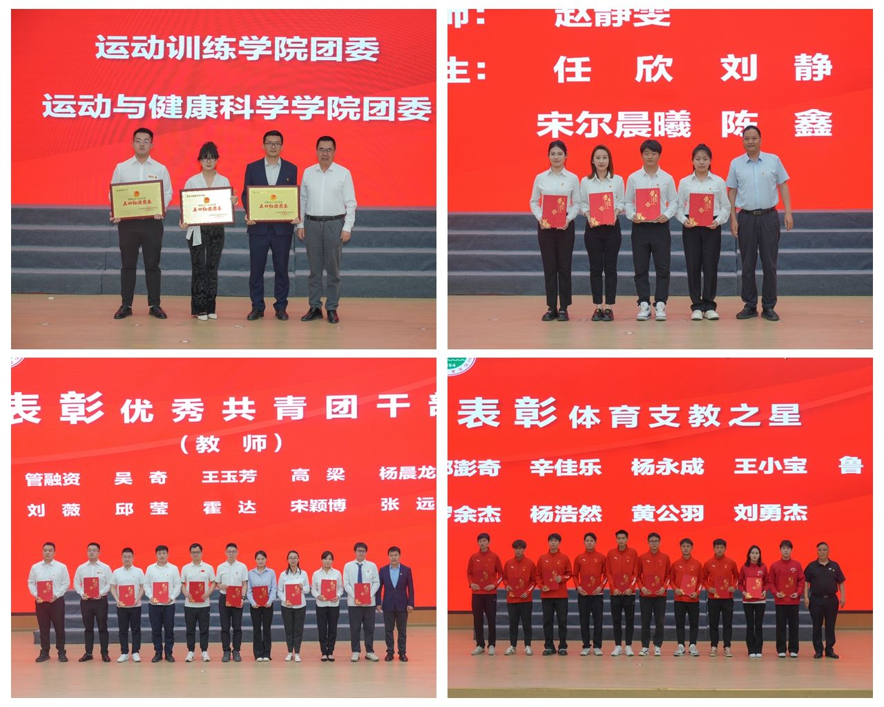 与会领导分别为2024至2025年度万象城allwincity官网万象城青年五四奖章集体、五四红旗团委,万象城青年五四奖章、优秀共青团干部、优秀共青团员以志愿者优秀集体和个人颁奖。体育教育学院团委书记宗月民、青年教师代表汤自龙、竞技体育学校殷腊梅作为获奖代表进行了发言。
