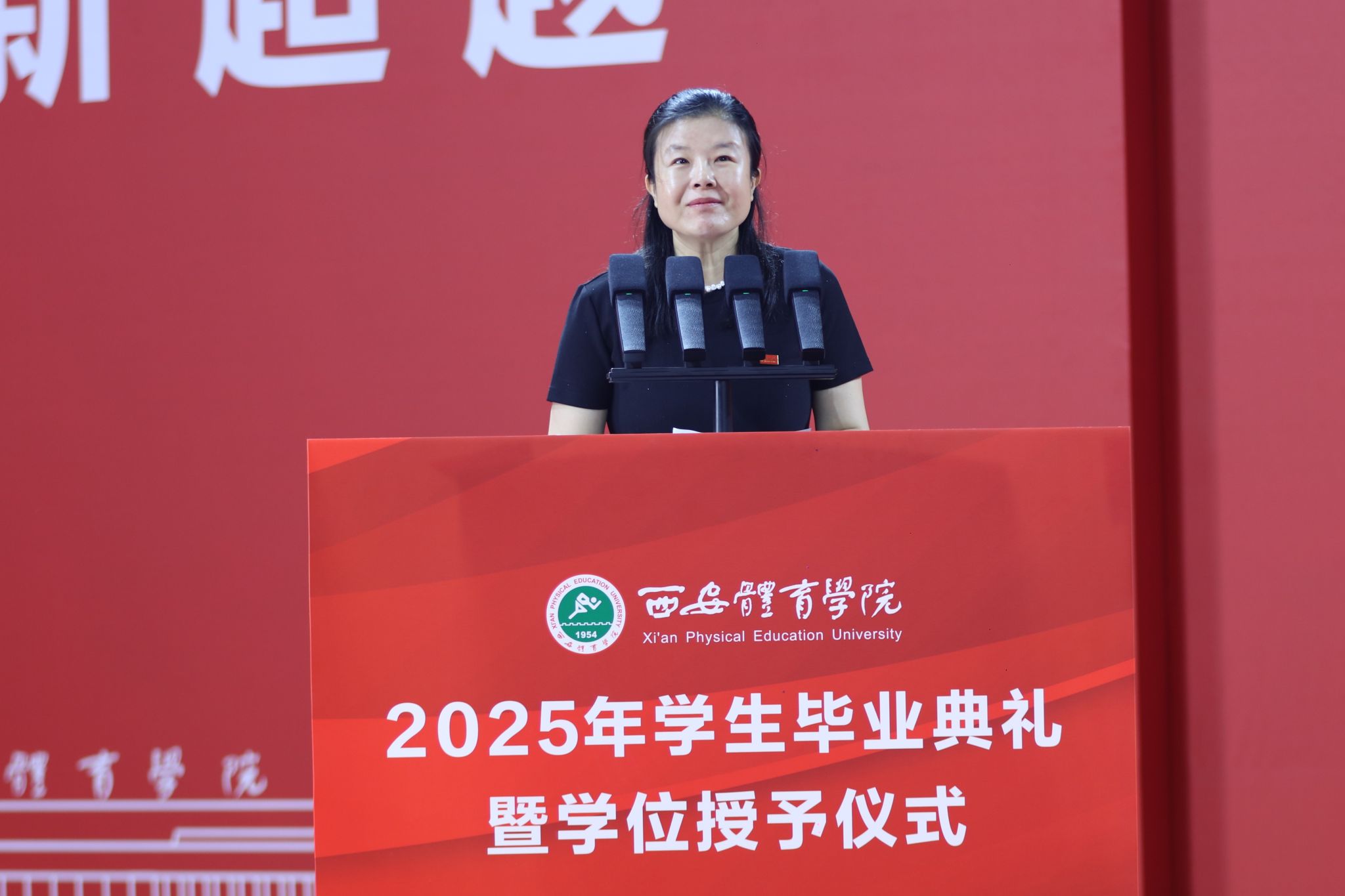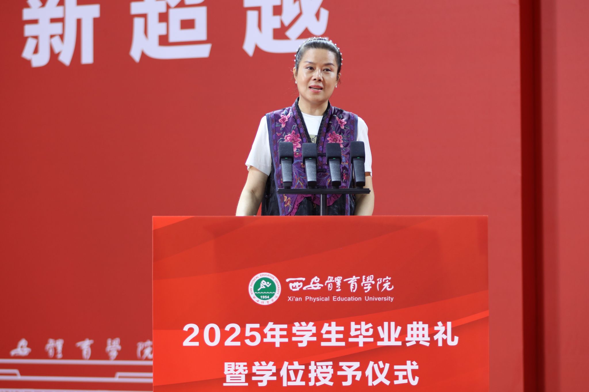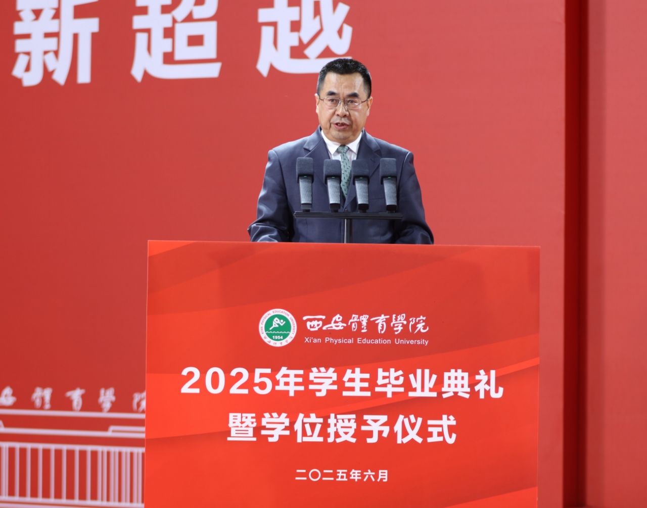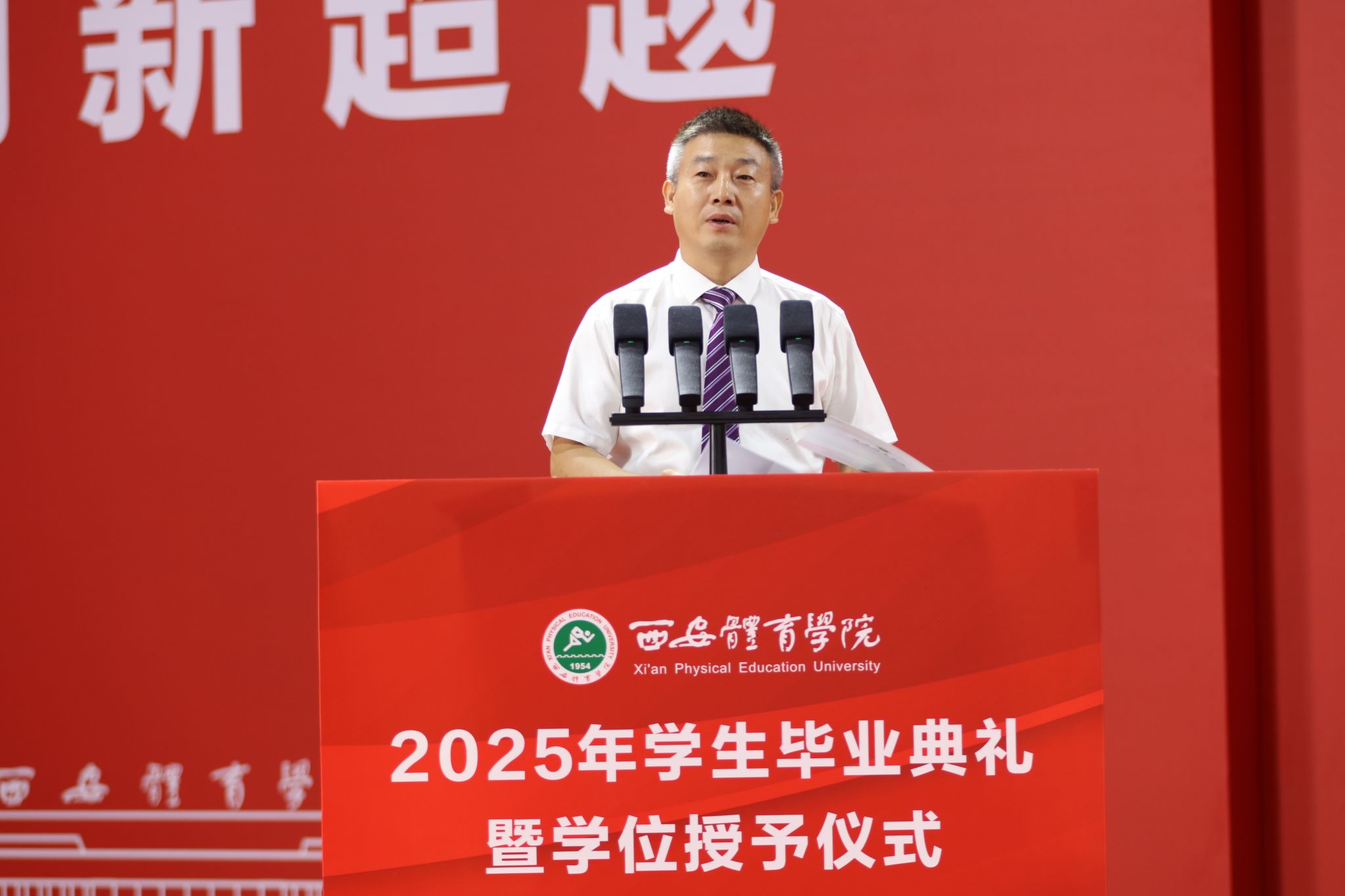 李富生以“砺剑鄠邑酬壮志 扬帆星海启新程”为题作深情毕业寄语,他回顾了学子们与学校共同成长的宝贵历程。他表示,同学们作为鄠邑主校区的首届毕业生,见证了学校的蝶变:现代化教学设施拔地而起,办学硬件条件率先进入全国体育院校第一方阵;“小班教学”“万象城小全运”“省队校办”等创新举措成效显著,体育支教、足球改革、高水平赛事承办等成果丰硕。李富生指出,万象城学子既是学校改革发展的见证者,更是新校区建设、建校70周年系列活动、重大赛事承办等重要事件的参与者,展现了责任与担当。未来学校将打造高水平人才培养高地、高水平运动队、高水平训练基地、高水平赛事中心、高水平产业基地贡献万象城力量。离别之际,他向2025届毕业生送上殷殷嘱托:一是以自信自立之姿,做时代浪潮的掌舵者;二是以守正创新之道,做文明星火的传承者;三是以担当奉献之志,做基层沃土的深耕者;四是以终身学习之态,做人生旅程的领跑者。他勉励毕业生将个人理想融入民族复兴伟业,在各自领域成就非凡,并深情祝愿他们前程似锦,鹏程万里。