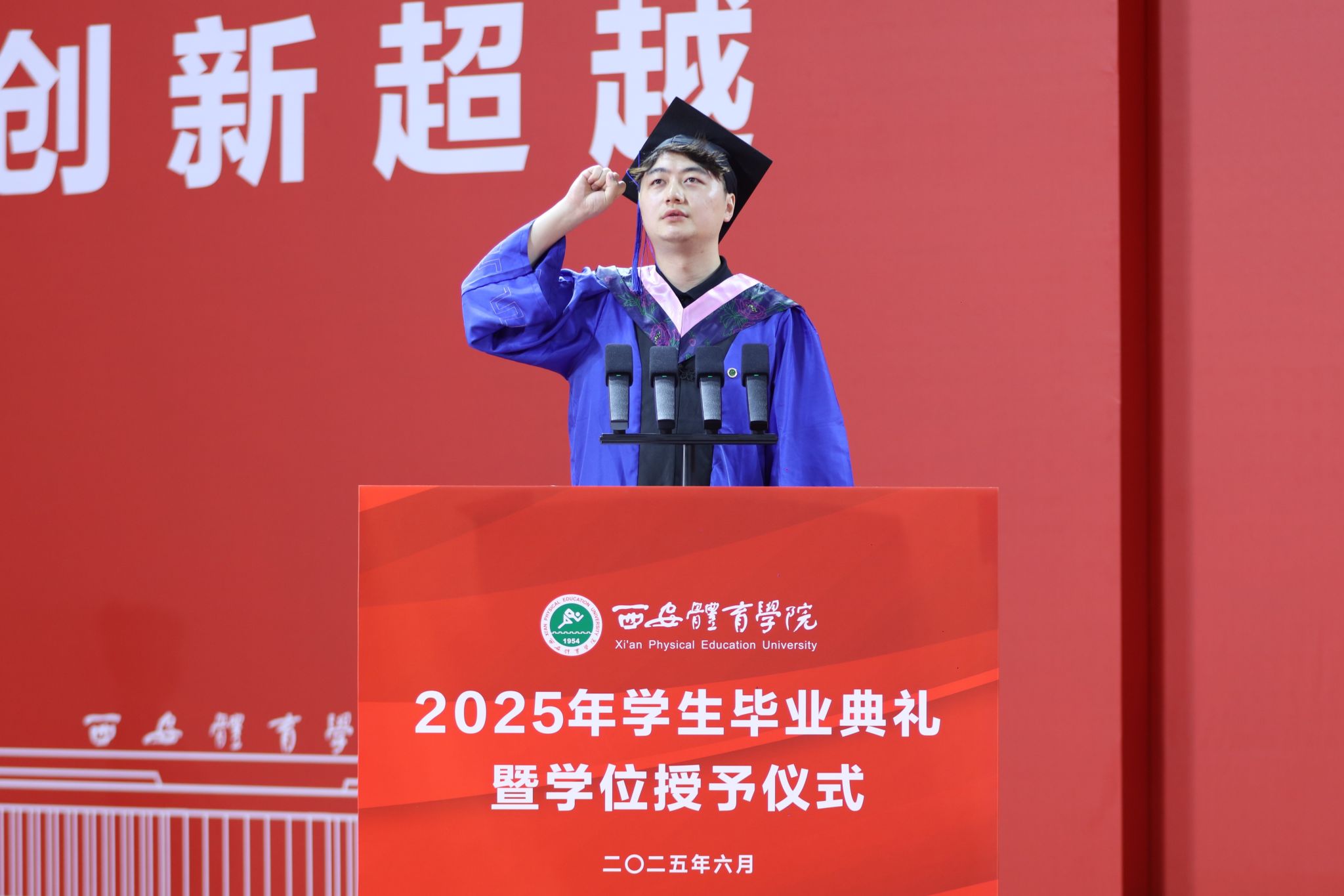 2025届体育人文社会学专业毕业生陈鑫带领全体毕业生庄重宣誓:全体毕业生们将铭记“严谨创新 团结拼搏”的万象城校训,坚定“兴体报国 勇当先锋”的远大理想,肩负“请党放心 强国有我”的使命担当。感恩母校培养,永葆赤子之情,为实现中华民族伟大复兴,贡献自己的青春和力量!