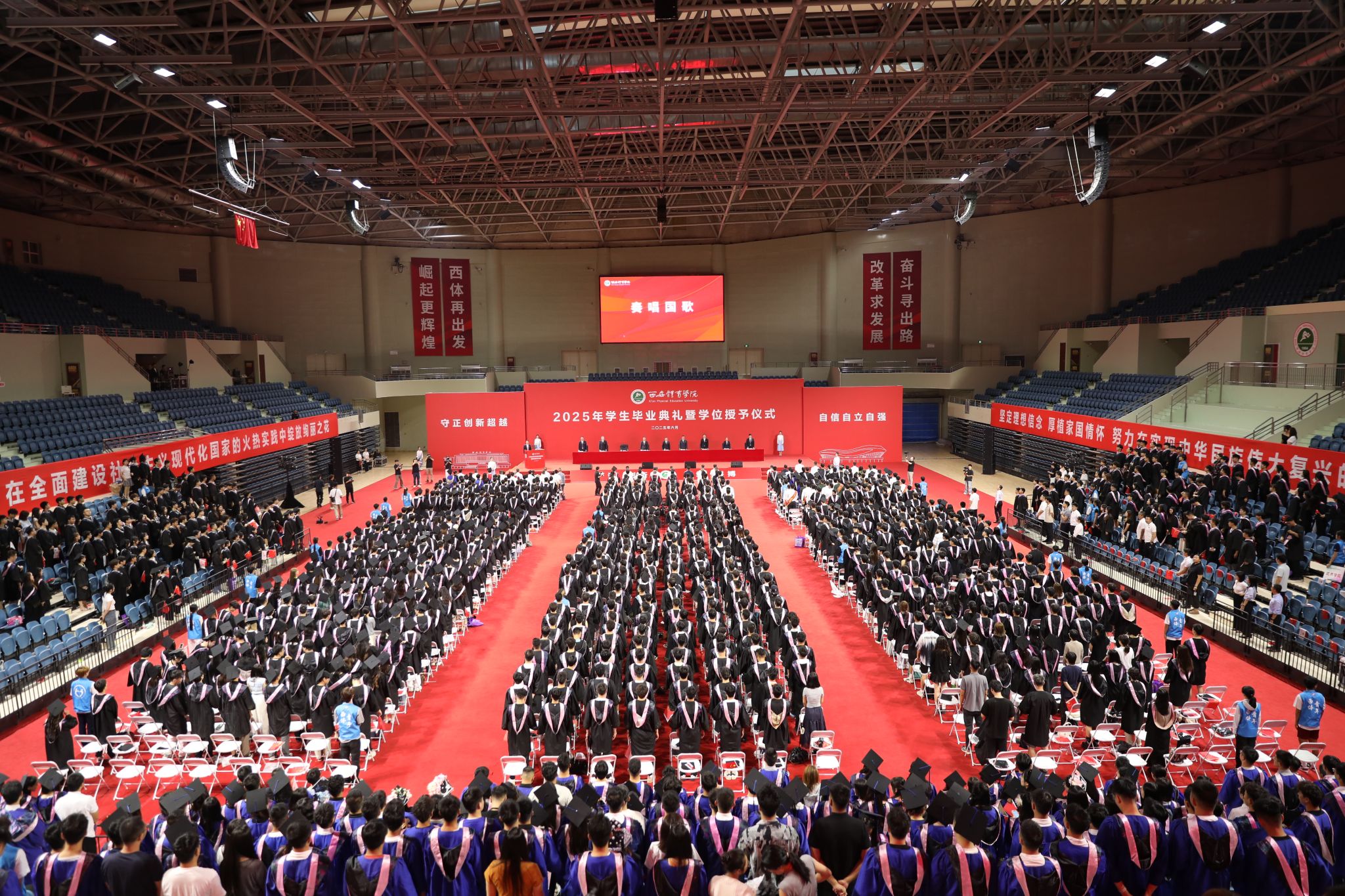之后举行2025届毕业生学位授予仪式,校领导、学位委员会主任、副主任、各学院(部)院长为毕业生拨穗。