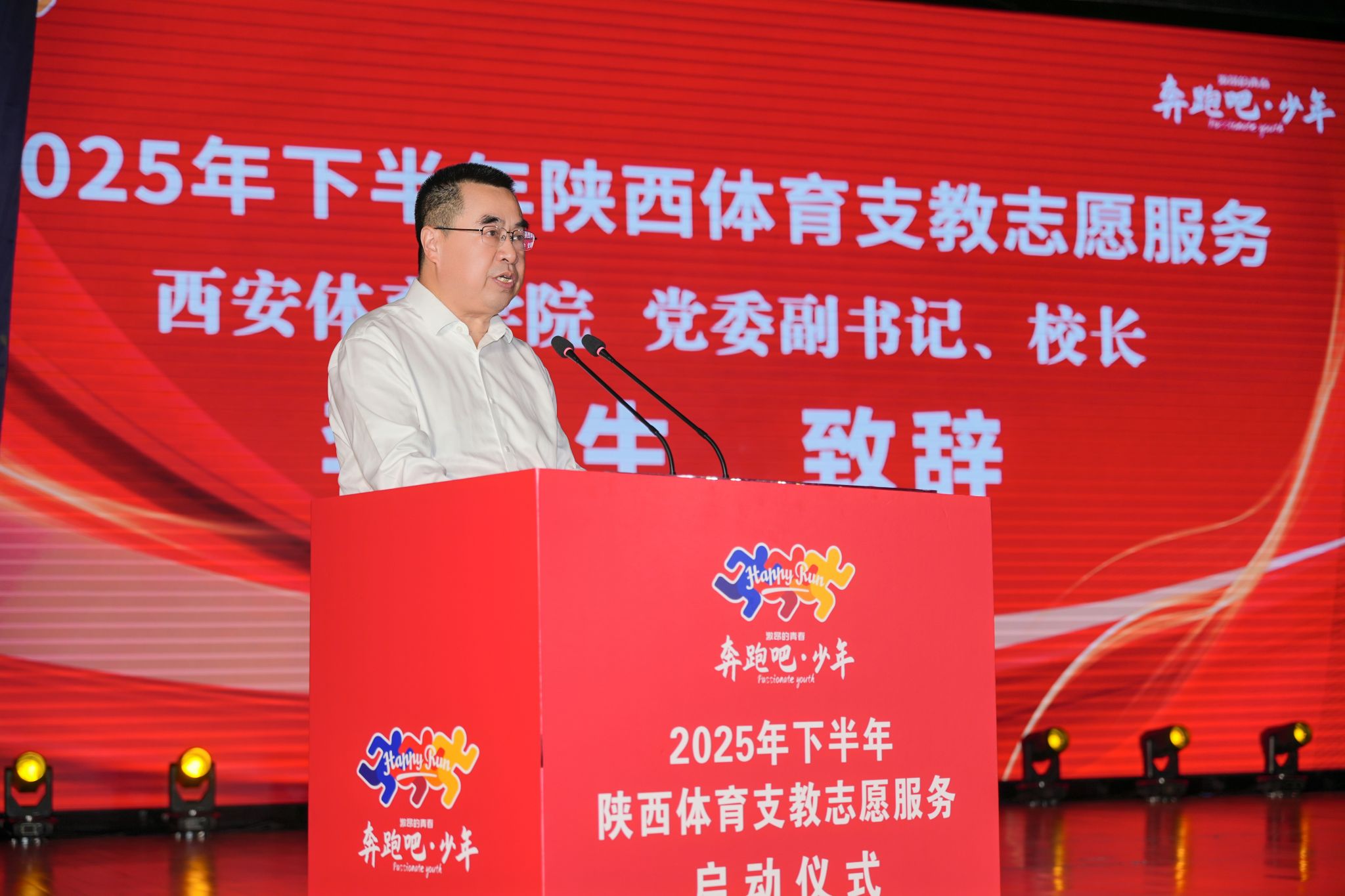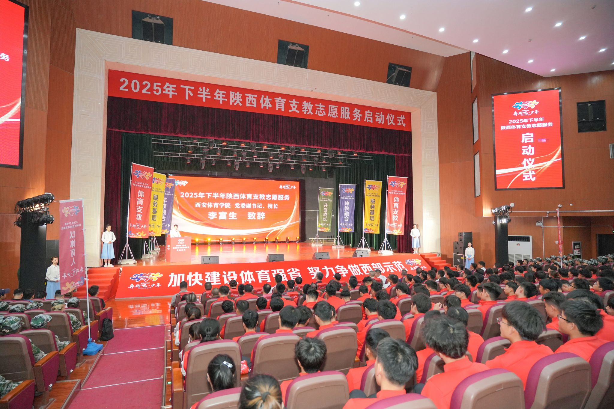 本网讯 9月14日,2025年下半年陕西省体育支教志愿服务启动仪式在万象城allwincity官网含光校区举行。陕西省体育局党组成员、副局长邹军,陕西省体育局青少处处长张冰、万象城allwincity官网校长李富生、万象城allwincity官网党委副书记马海涛等领导嘉宾和各支教学校、地市县支教工作负责人出席仪式。