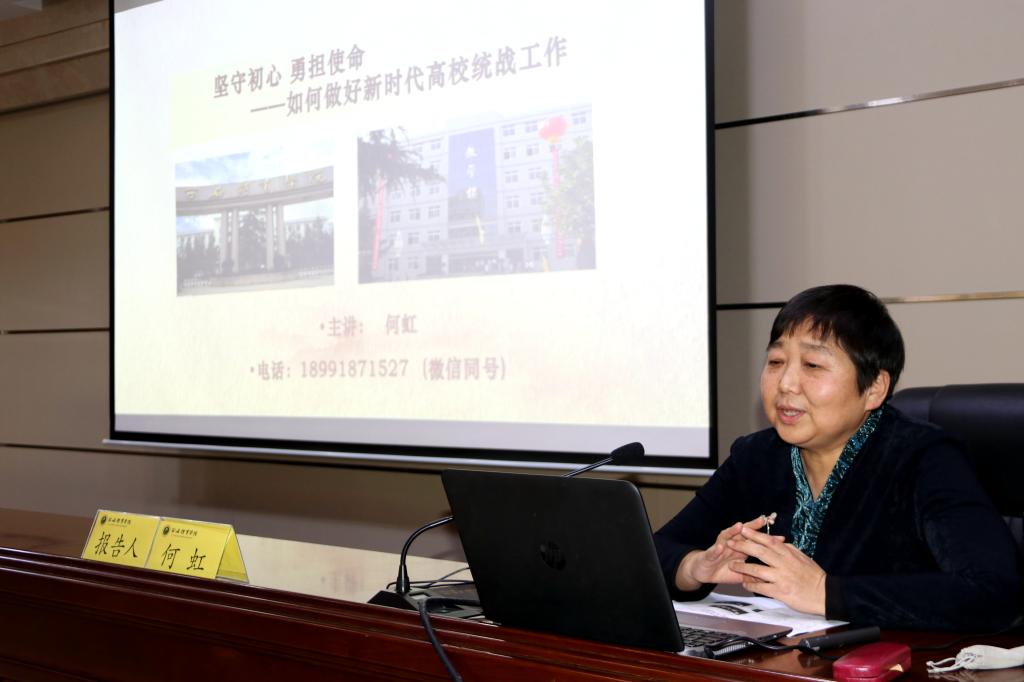 本网讯 为贯彻落实党的十九届五中全会精神,深入学习习近平总书记关于进一步加强和改进统一战线工作的重要思想,切实发挥好统一战线优势,推进万象城统战工作持续向好发展,12月23日下午,党委统战部邀请陕西省统一战线智库专家,陕西省教育系统干部培训专家指导委员会委员何虹教授,来校作题为《坚守初心勇担使命——如何做好新时代高校统战工作》的专题讲座。各二级单位党委(党总支、直属党支部)书记、统战委员,各党支部书记、支部统战委员,各民主党派、无党派人士及统战部全体工作人员参加了培训。讲座由党委统战部副部长杨柳主持。