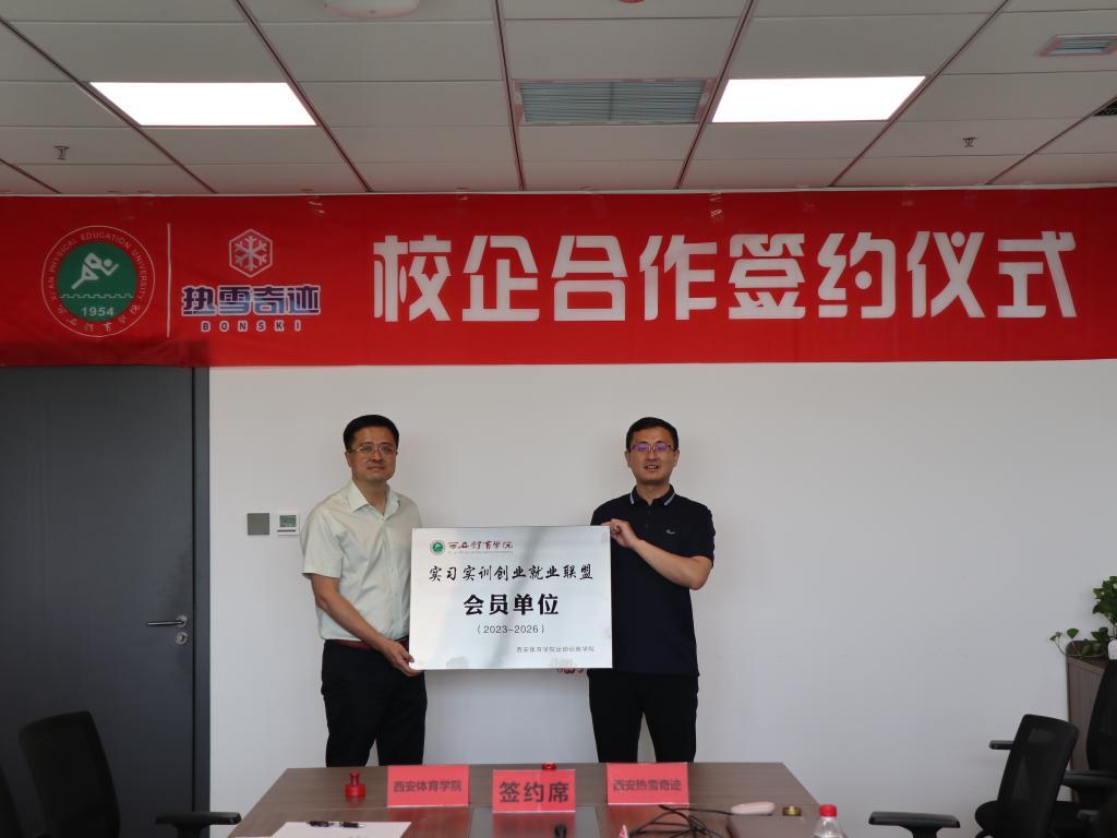本网讯 6月21日,副校长张卫国带领鄠邑校区管委会、运动训练学院领导班子成员、各教研室主任及教师代表一行13人来到融创文旅旗下的西安热雪奇迹体育发展有限公司进行实地考察调研。校企双方就合作项目进行了深入充分的交流座谈,签署了“运动训练学院实习实训就业创业联盟”战略合作协议并予以授牌。西安热雪奇迹体育发展有限公司总经理陈志强、人力行政部经理禹洁、滑雪学校校长魏堂勇、自由式滑雪世界冠军滑雪学校总教练陈康等参加了此次签约仪式。