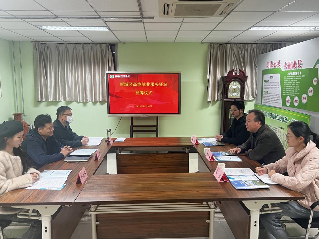 本网讯 11月30日,学生工作处与新城区人社局共建高校就业服务驿站座谈会在学生工作处会议室举行。学生工作部(处)长王志刚、就业中心主任王鹏,新城区人社局副局长吴全泰、人才中心主任孟贝及相关负责同志参加本次活动。