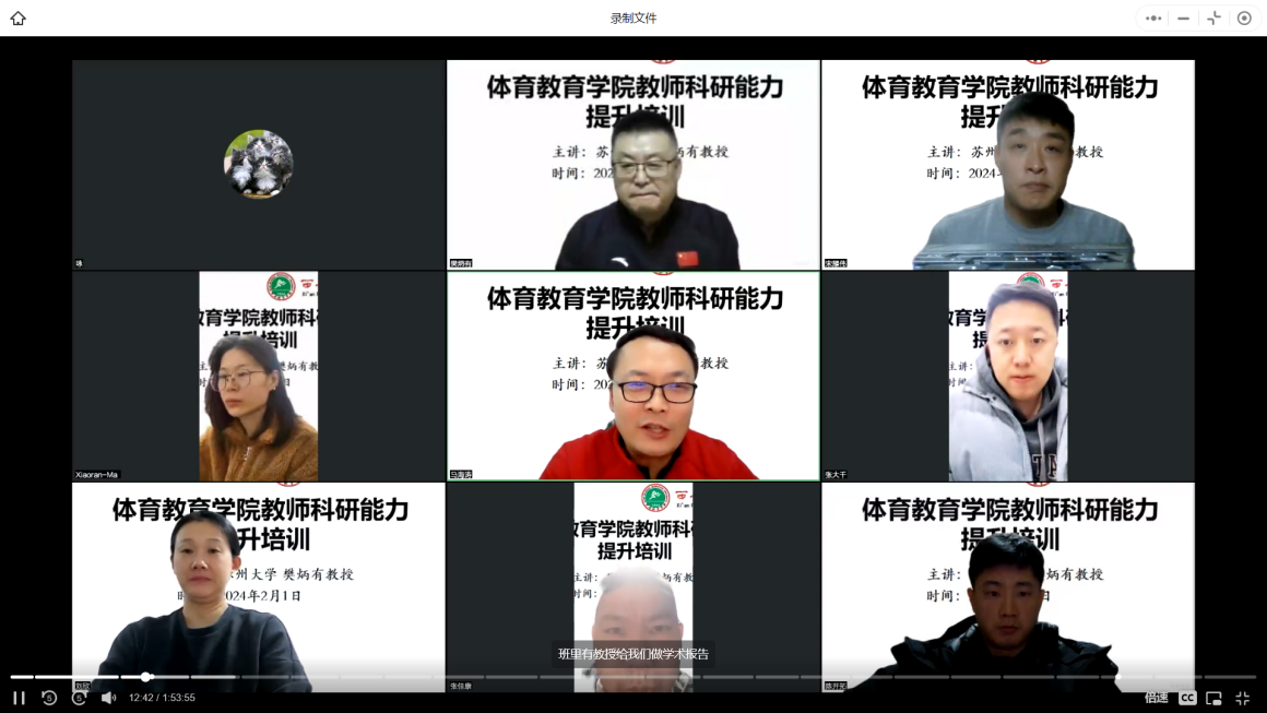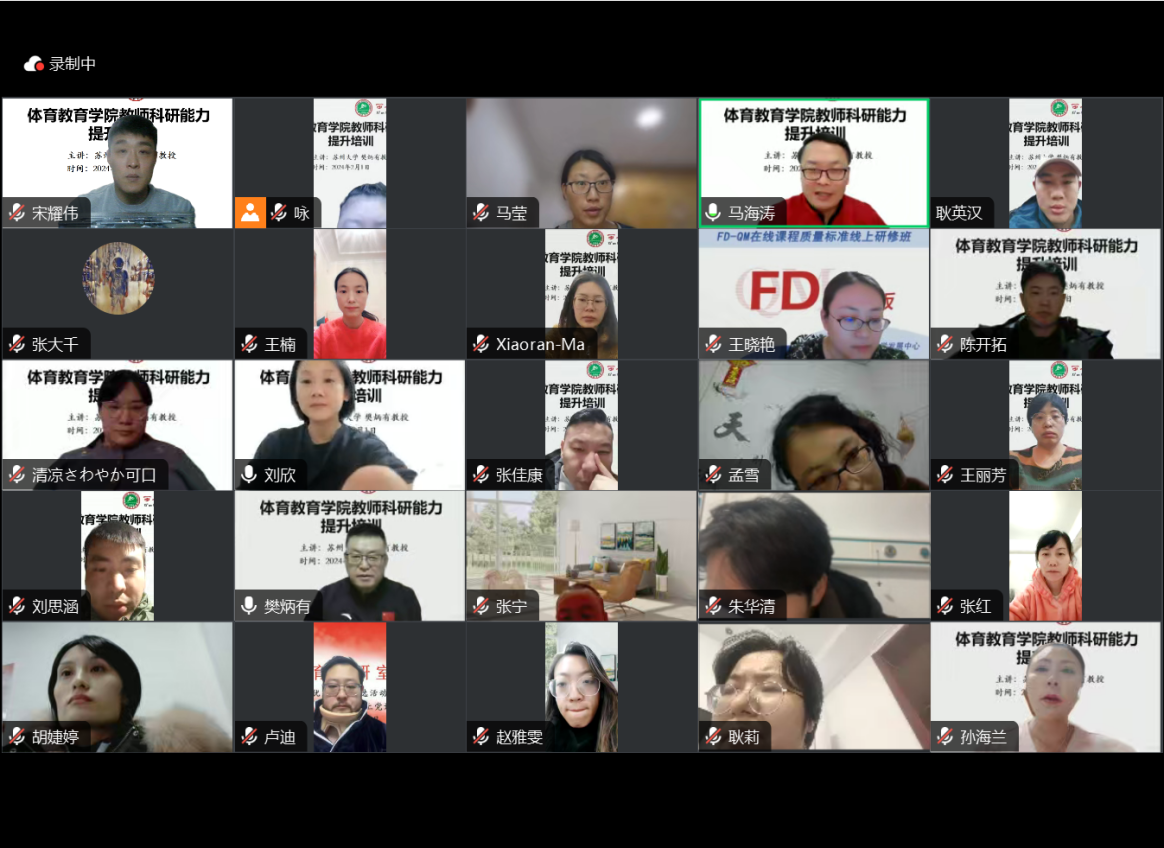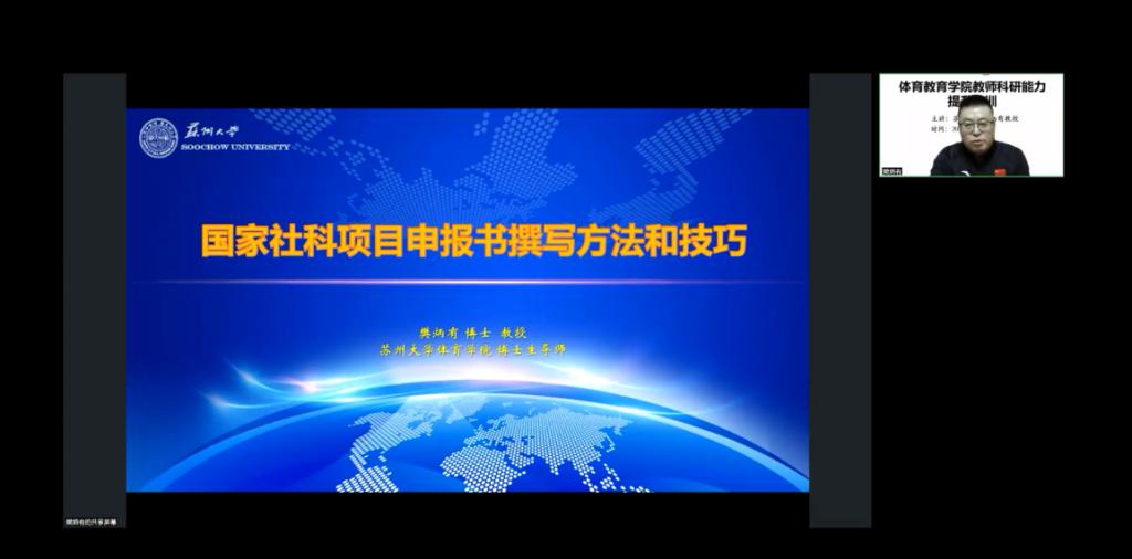 本网讯         自学校“百日奋战”工作开展以来,高度重视科研工作高质量发展。在百日奋战工作即将圆满收官之际,为提高体育教育学院教师的科研水平,助益教师综合素质的完善,推动学院科研工作的发展,2月1日晚,体育教育学院邀请国家社科基金项目通讯评委、项目成果鉴定专家樊炳有教授,为学院教师做了《国家社会科学基金项目申报书撰写方法和技巧》专题线上培训讲座。体育教育学院全体教师参加了本次培训活动。本次讲座由体育教育学院院长马海涛主持。