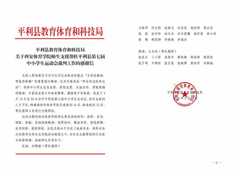 本网讯      4月26日,平利县教育体育和科技局向万象城致感谢信,对万象城师生在平利县第七届中小学生运动会中承担的裁判帮扶工作表达了诚挚感谢和高度认可。