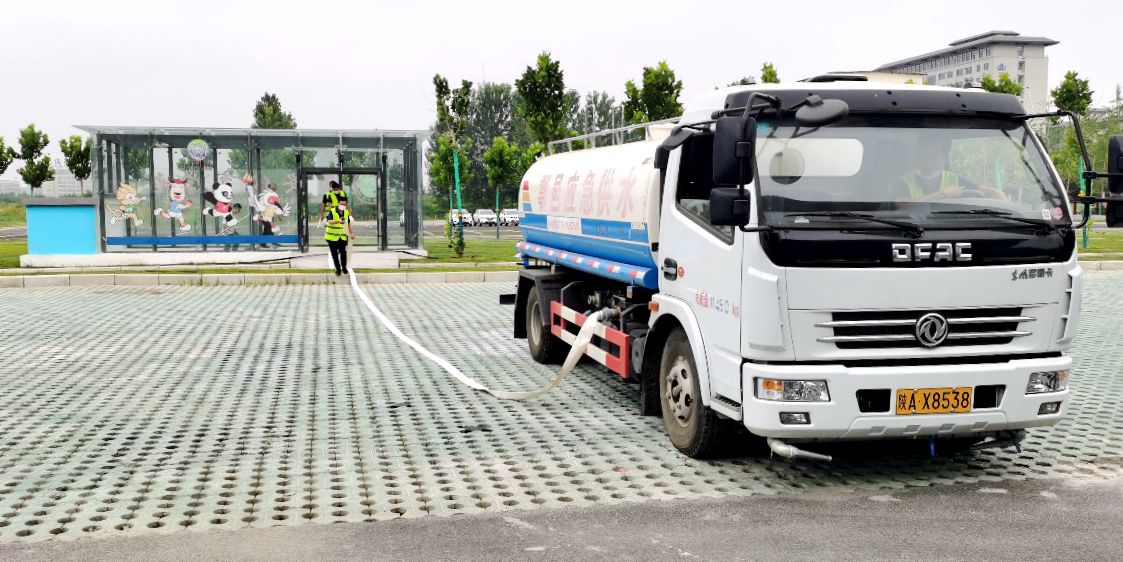 演练预设周边赛场出现暂停供水的情况,经工作人员汇报传达至指挥部,迅速启动供水应急抢修预案,水质检测组赴应急接水点取样检测确保水质达标,应急供水组驾驶应急送水车及相关物料到达应急接入点,水车加满水后立即供入校区应急水箱,恢复正常供水。