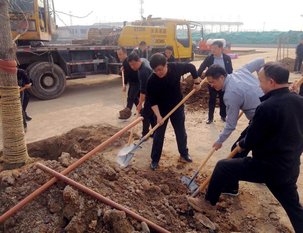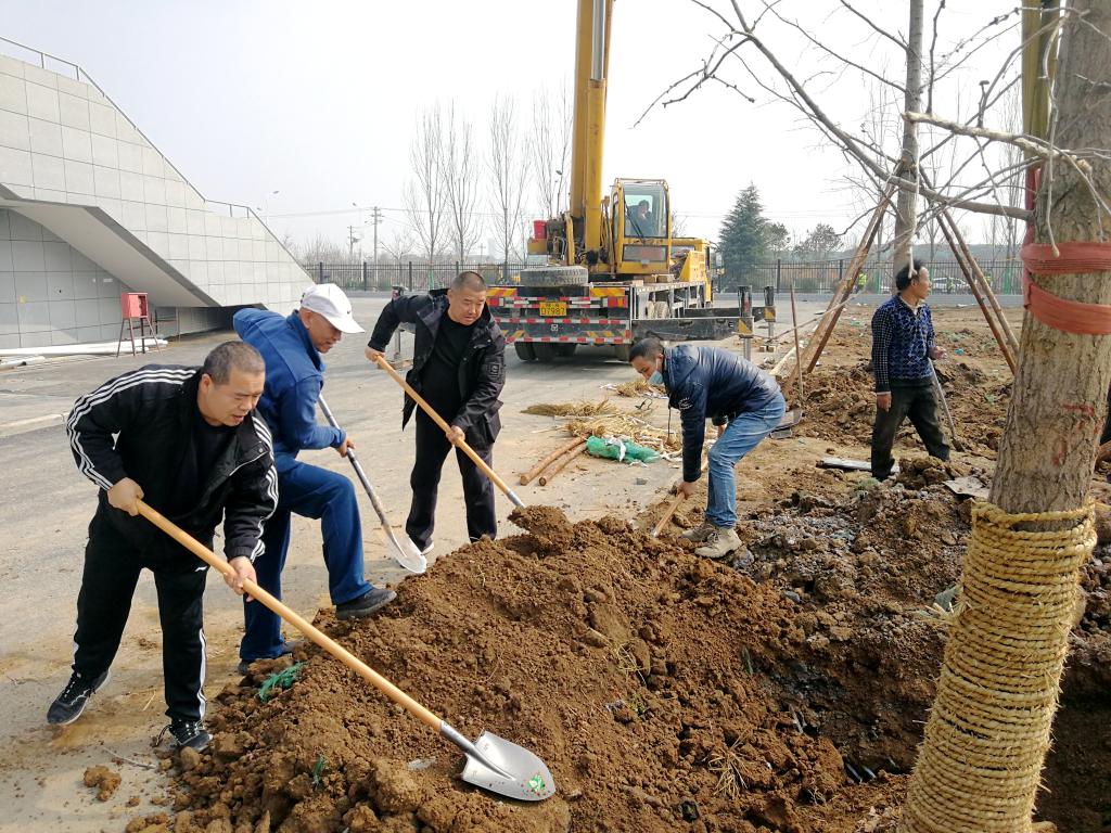 甘泽军(左三)带领基建处同志为银杏树填土
