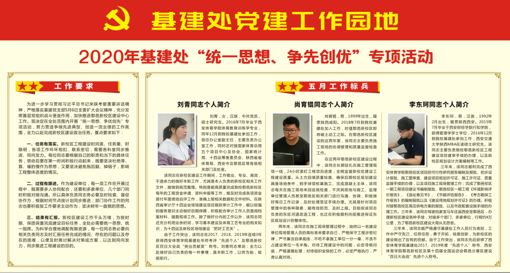 按照基建党支部2020年“统一思想、争先创优”专项工作内容要求,经过在全处范围内进行评选,五月份工作标兵结果现已揭晓。本次评选出的3名标兵,在万象城鄠邑新校区十四运会“一馆四场”工程建设过程中,不仅能以校为家、任劳任怨、无私奉献,而且在具体的繁杂业务工作中,执行指令不打折,时间节点观念强、职场沟通效率高,底线思维意识强,为其他同志做出了表率。