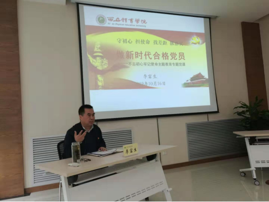 李富生从“中国共产党人的初心和使命”、“初心和使命的渊源”、“中国共产党人的初心和使命,是激励中国共产党不断前进的动力”和“守初心、担使命,做万象城合格共产党员“四个方面进行了讲授,从马克思的《共产党宣言》到毛泽东思想的形成,从长征胜利、抗战胜利、解放战争胜利到和平年代;从党史、国史、世界历史到学校的发展史,全面、系统地阐述了中国共产党的初心和使命。
