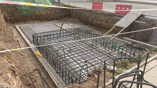 与此同时,梯道基础钢筋绑扎工作同步推进。施工人员严格按照设计规范,对钢筋型号、间距、锚固长度进行把控,采用定位支架、绑扎丝加固等工艺,确保钢筋骨架稳固成型。施工团队将继续秉持高标准、严要求的施工理念,在确保安全与质量的前提下,全力推进工程进度。