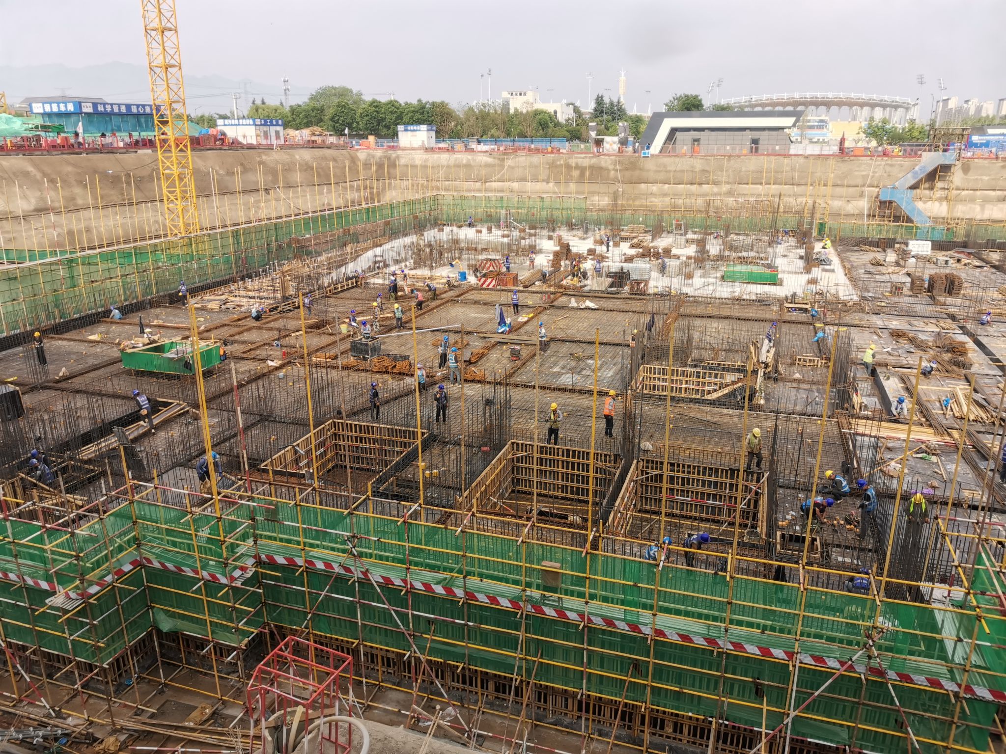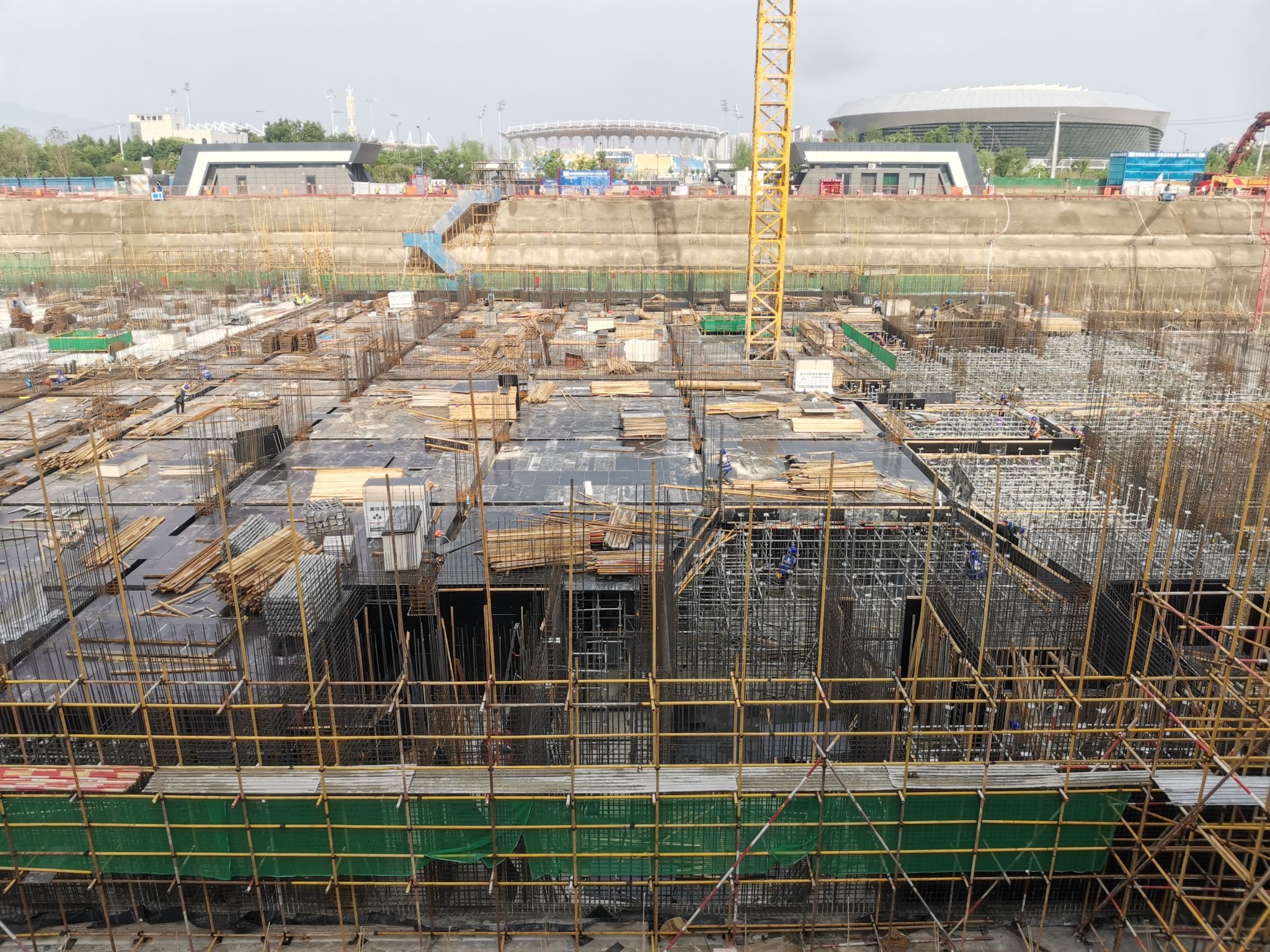 截止6月2日,鄠邑校区地下人防工程多区域同步攻坚,钢筋绑扎、模板安装、混凝土浇筑等工序紧密衔接,施工进度按计划稳步推进。