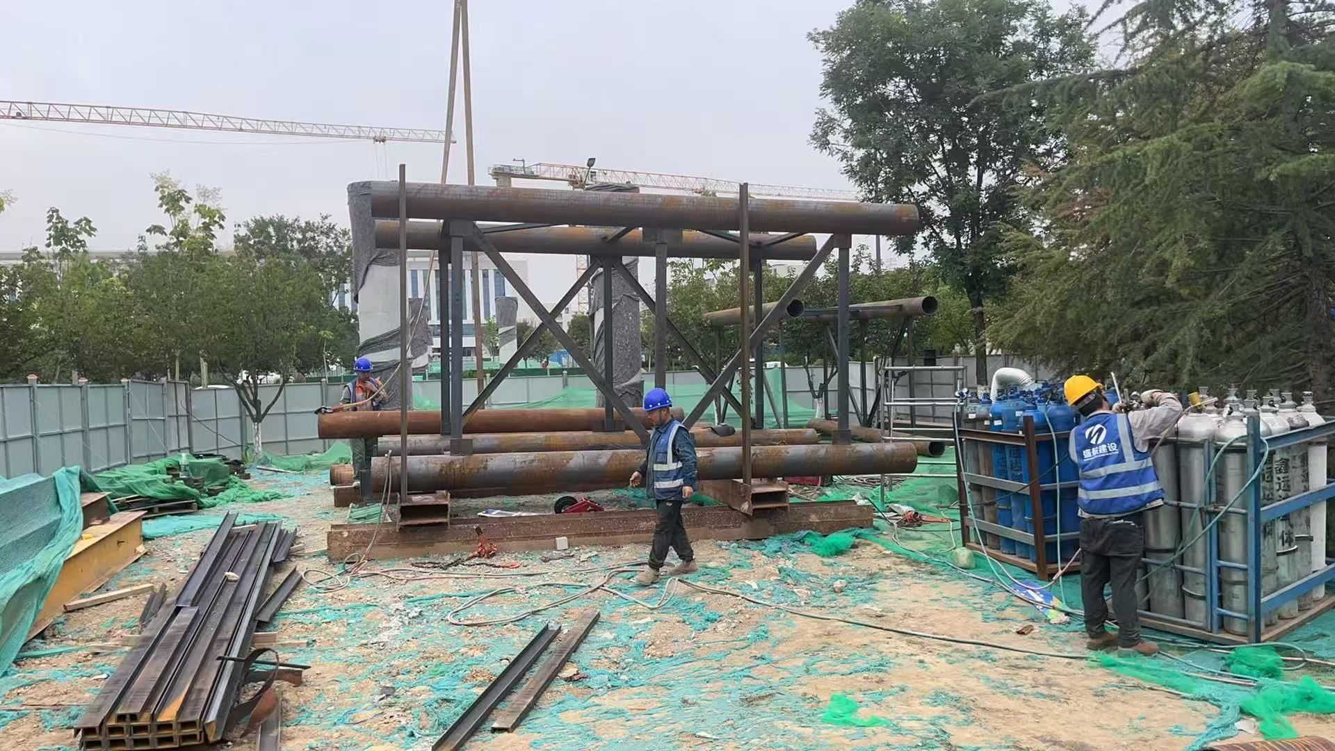 施工团队紧锣密鼓地开展支架加工焊接作业,临时支撑桥梁支架同步进行搭建。施工团队依据科学的施工方案,合理安排施工流程,对施工作业中的垂直度和稳定性实行全过程监测。保障施工安全和天桥结构稳定。