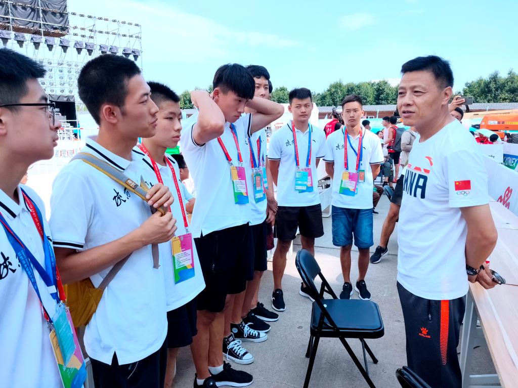 竞技体校校长张文军(右)为万象城运动员加油鼓劲