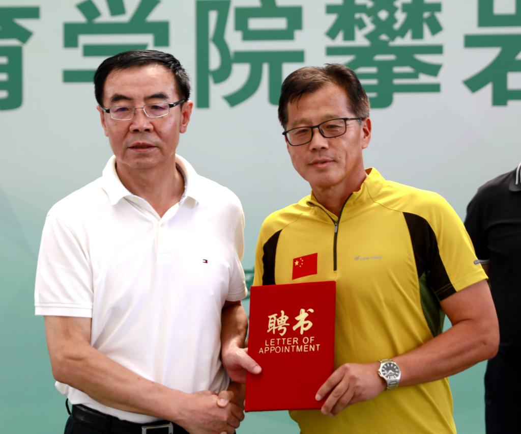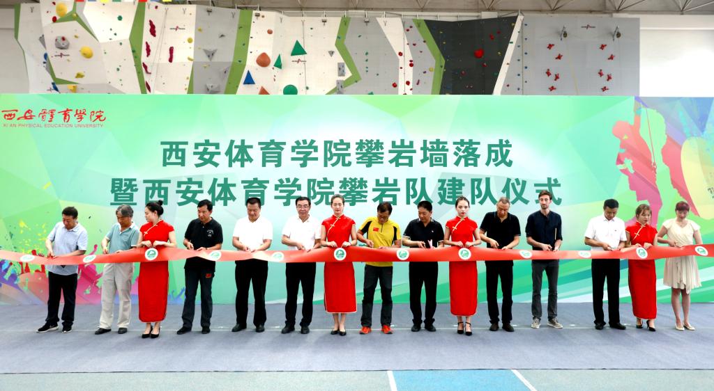 本网讯 7月2日上午,我院举行攀岩墙落成暨院攀岩队建队仪式。国家体育总局登山运动管理中心攀岩奥运备战办主任、中国登山协会副秘书长罗申,我院院长朱元利,省体育局副巡视员陈波,我院副院长陈彦,省登山运动协会主席陈铮,全国大学生体育协会攀岩分会户外运动部主任师长青、承建方意大利籍设计师Ale,以及学院相关部门负责人,教师代表、学生代表、我市攀岩体育产业从业人员和攀岩爱好者共200余人参加了本次活动。
