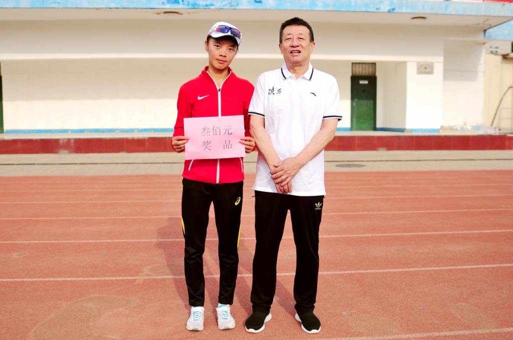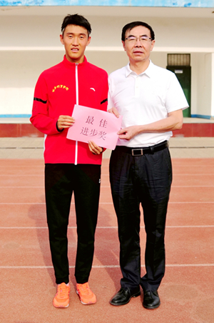 朱元利(右)为获得最佳成绩奖的男子成年十公里运动员李炎东颁奖