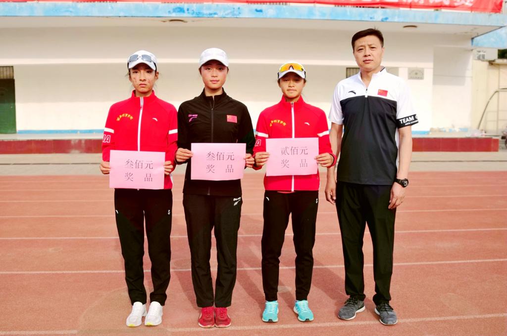 张文军(右)为女子青年十公里组运动员殷腊梅、李敏(并列第一)、王琳芝颁奖