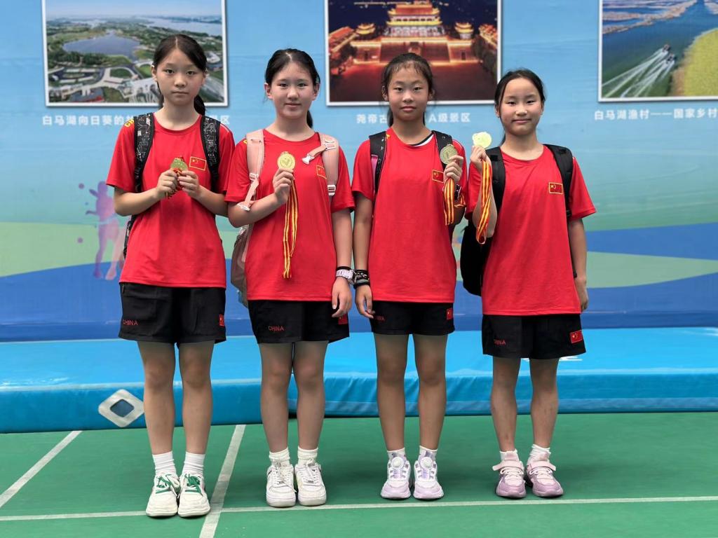 女子双蹦床团体冠军从左至右李茜楠、史嘉锌、杨听、石欣路