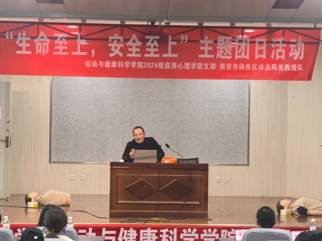 出席本次主题团日活动的老师有:西安市阎良区体总阳光救援队理事长王永权老师、阎良红十字会应急救护培训师黄振振老师、学工办主任苏菲老师、辅导员杨子欣老师、杨晨龙老师、陈鑫老师。