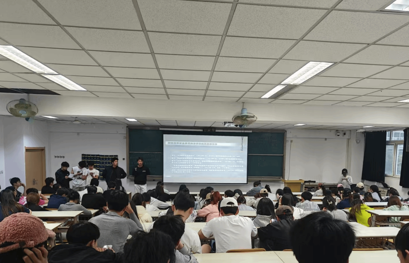 学院报告厅座无虚席,学生们全神贯注观看直播课程