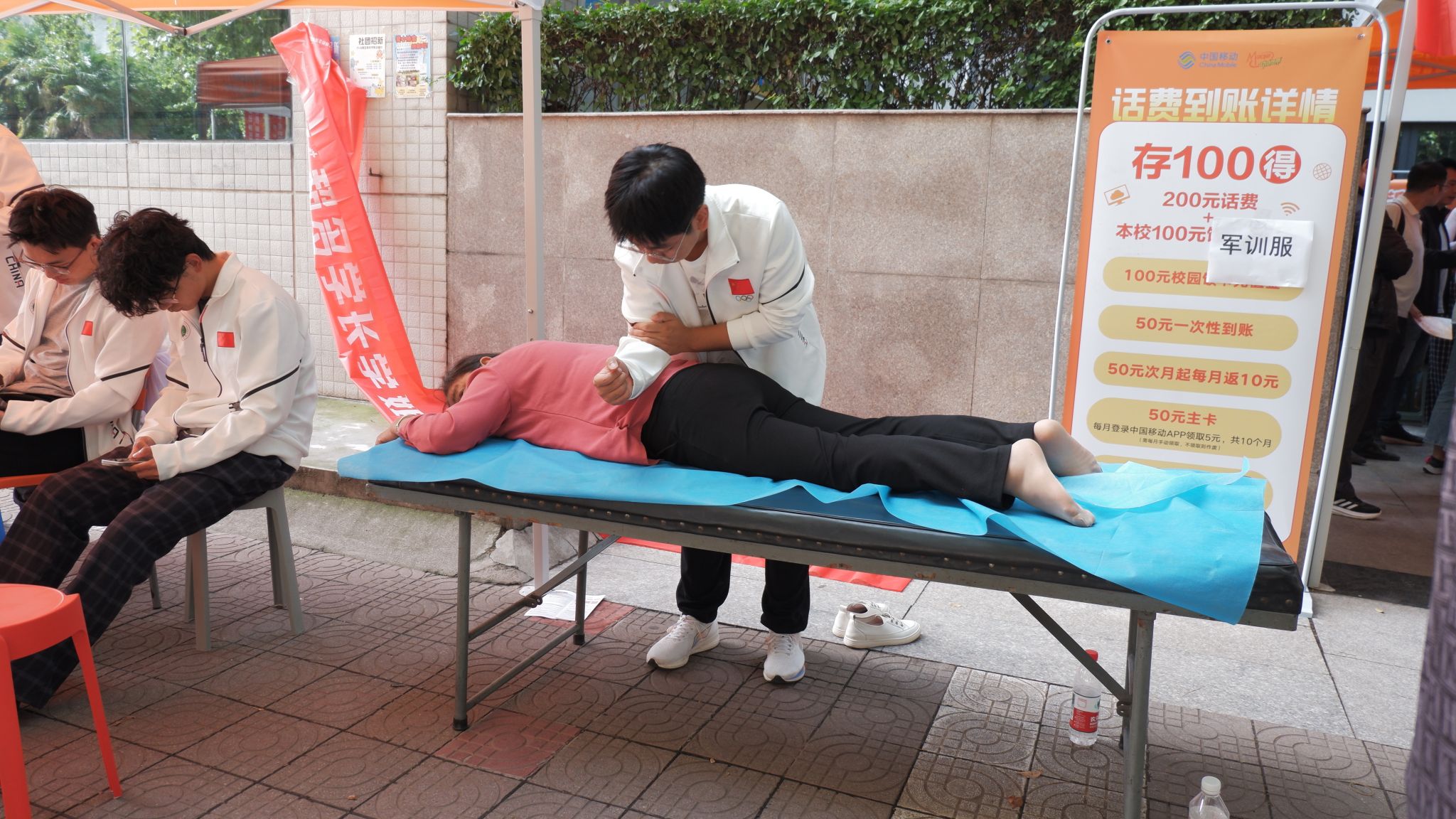 我院特色社团康复保健协会也为学生、家长们提供按摩服务,充分展示社团特色,让新同学对本院社团产生极大兴趣。