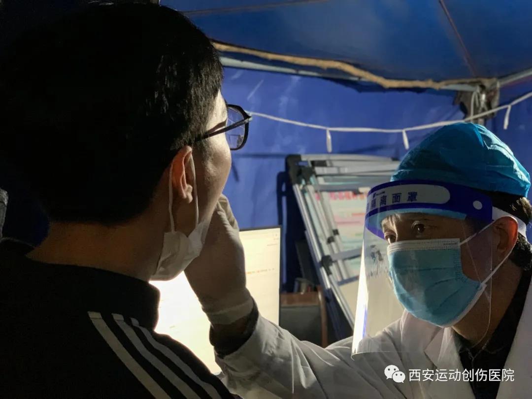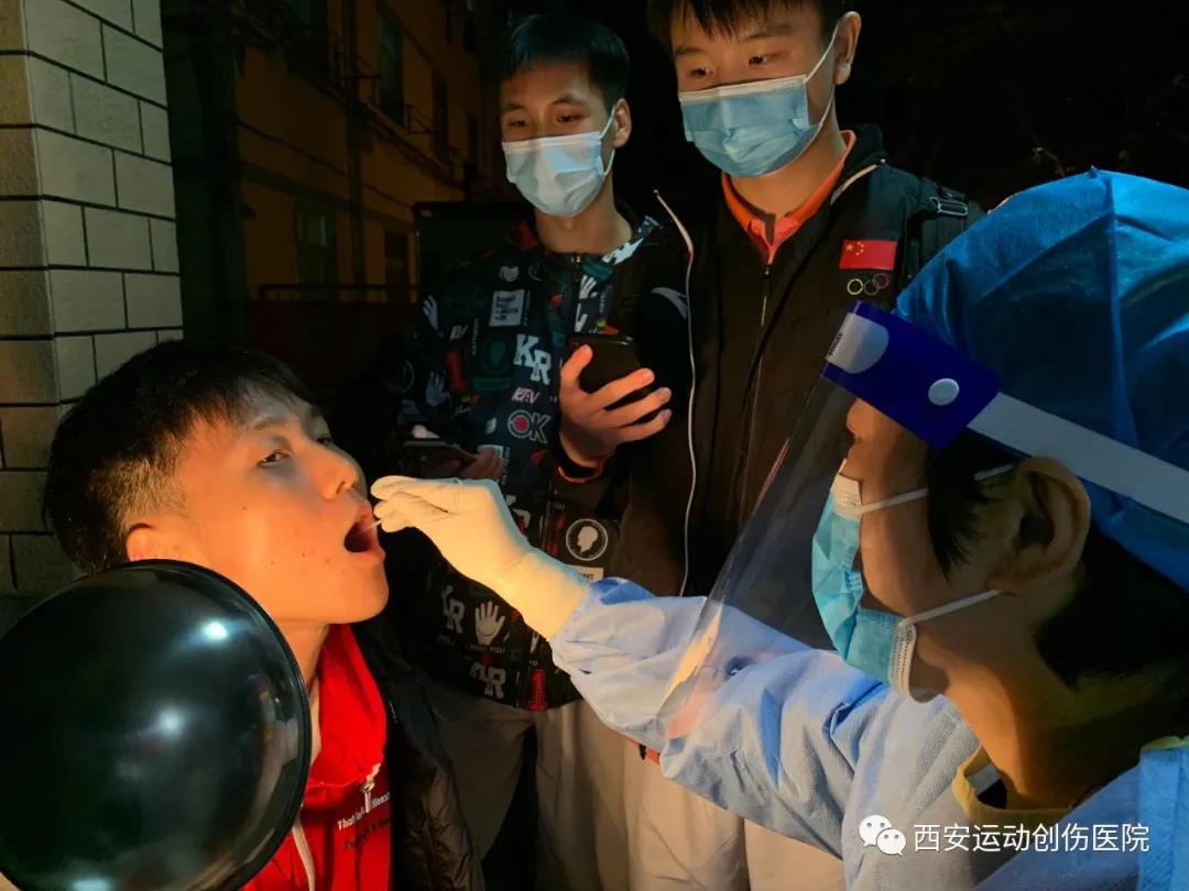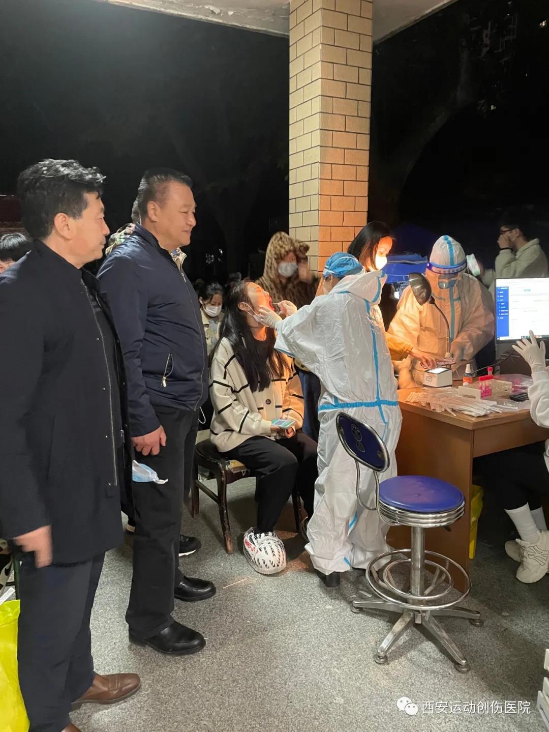 教学实验医院院长何昌谋,亲自上阵,为师生采集核酸咽拭子标本。